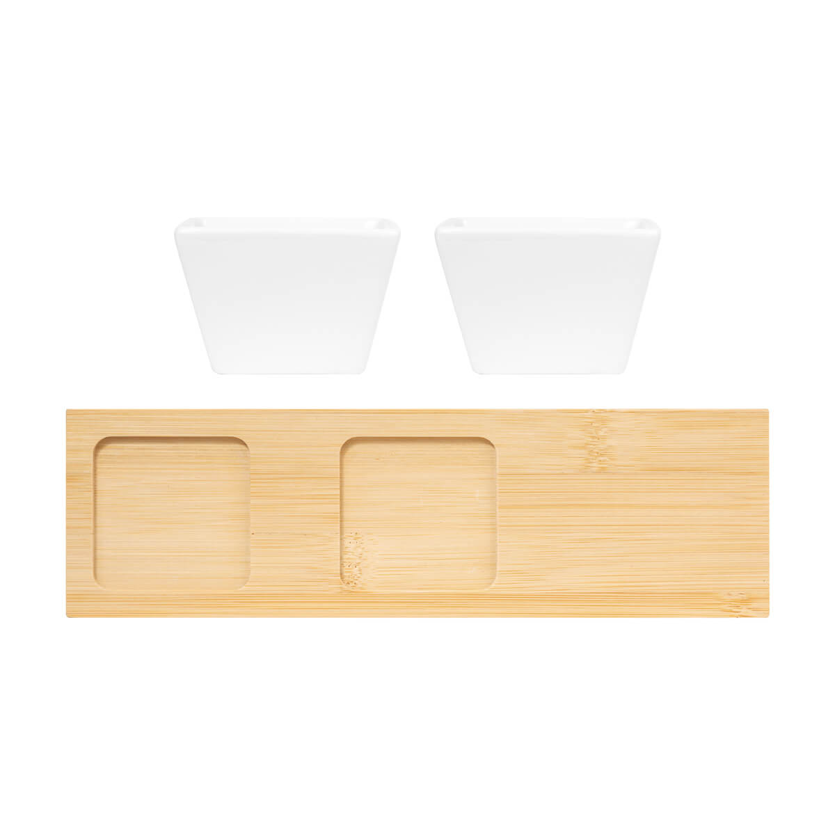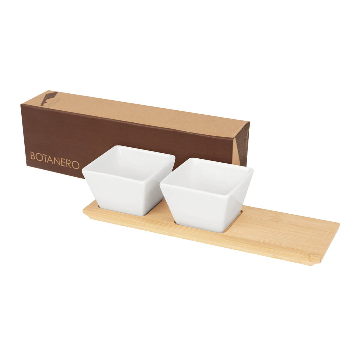 Descripción del producto: Botanero con base de bambú y dos contenedores de cerámica. Perfectos para servir botanas, dips o salsas con estilo. Ideal para reuniones, cenas o cualquier ocasión donde el diseño y la practicidad se encuentren. Incluye caja individual. El bambú es un producto natural el cual puede presentar variaciones en tonalidades y vetas. |