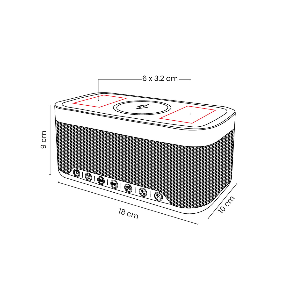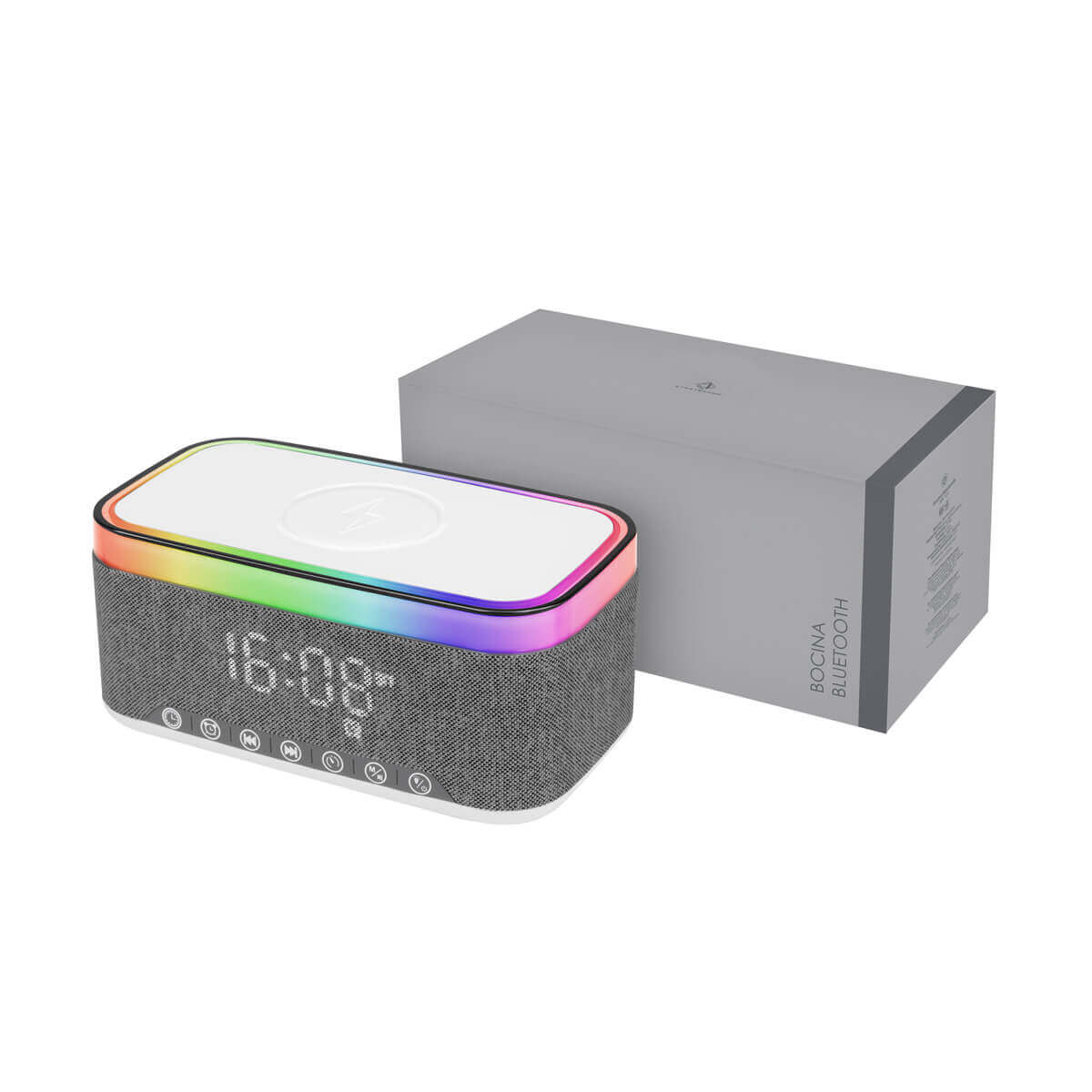 Descripción del producto: Reloj despertador multifuncional. Integra una bocina con tecnología Bluetooth 5.3, cargador inalámbrico de 15 W e iluminación ambiental con 6 modos de luz. El reloj digital ofrece 3 niveles de brillo (bajo, medio y alto). Cuenta con base antideslizante para evitar movimientos no deseados. Incluye cable de carga tipo C y caja individual. |