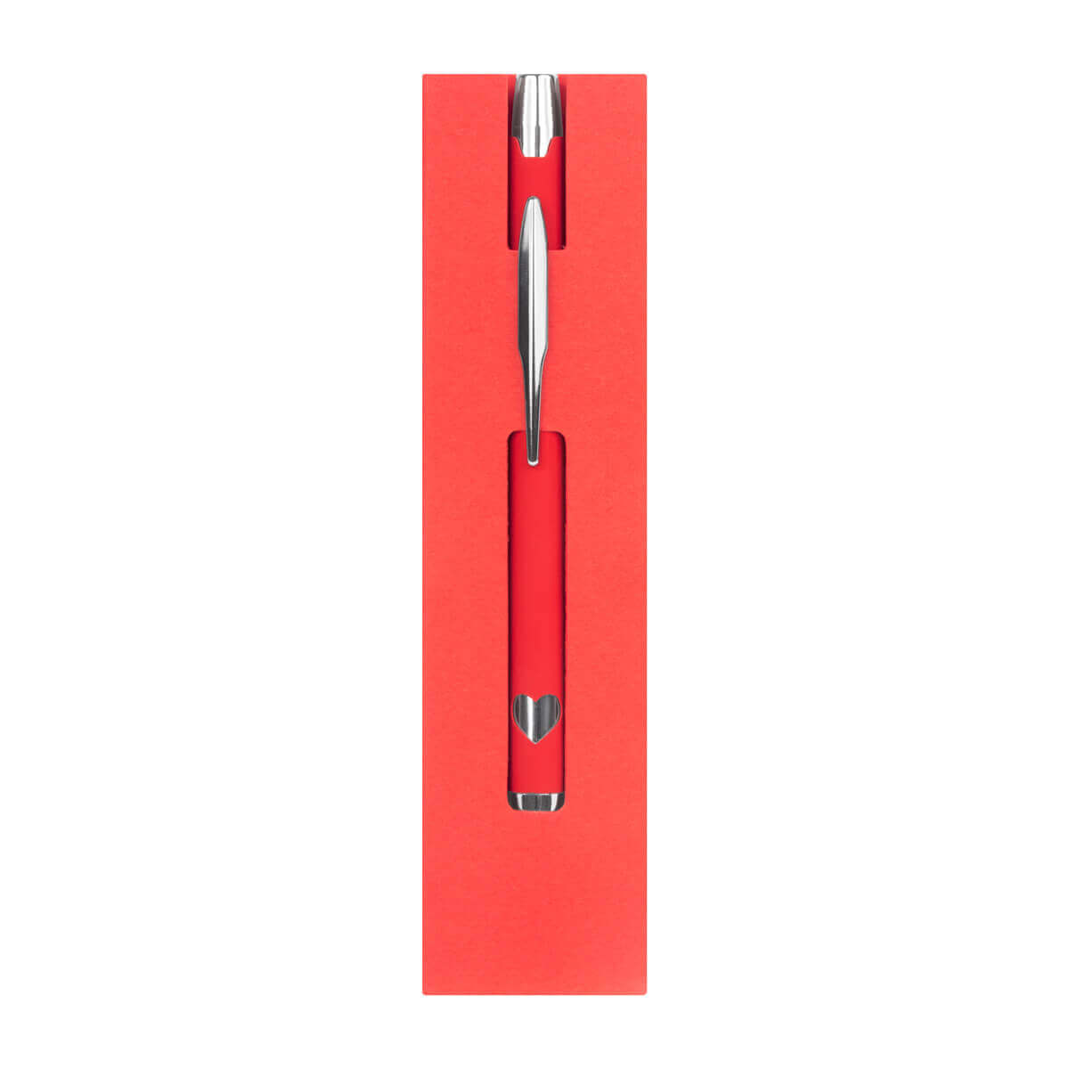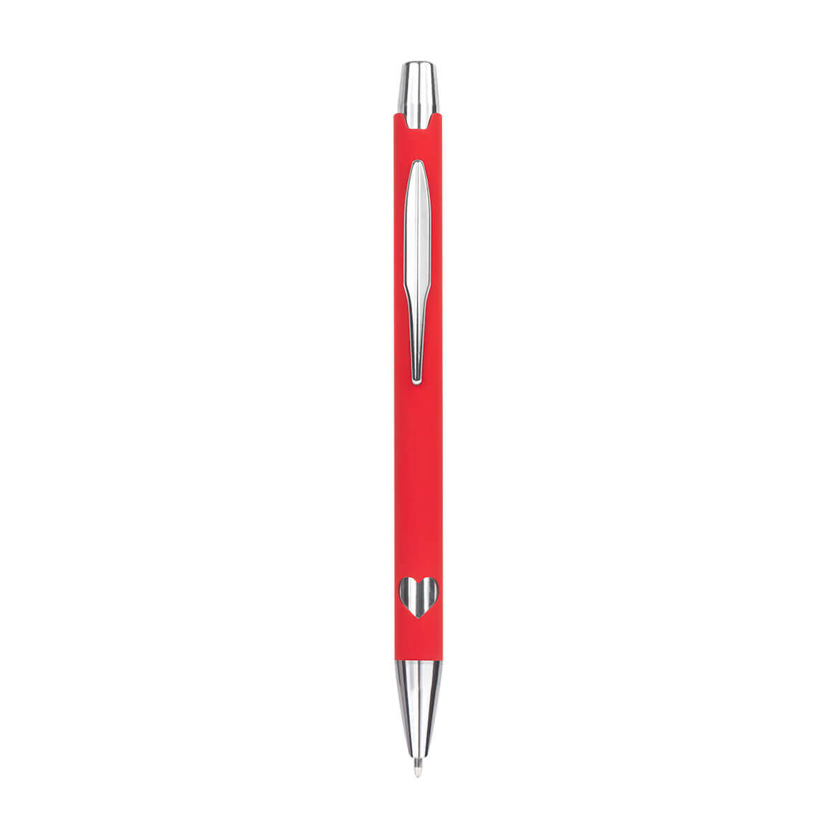 Descripción del producto: Bolígrafo metálico doble acabado mate en el cuerpo y detalles cromados con suaje en el cuerpo en forma de corazón. Mecanismo pulsador. Incluye funda con diseño. |