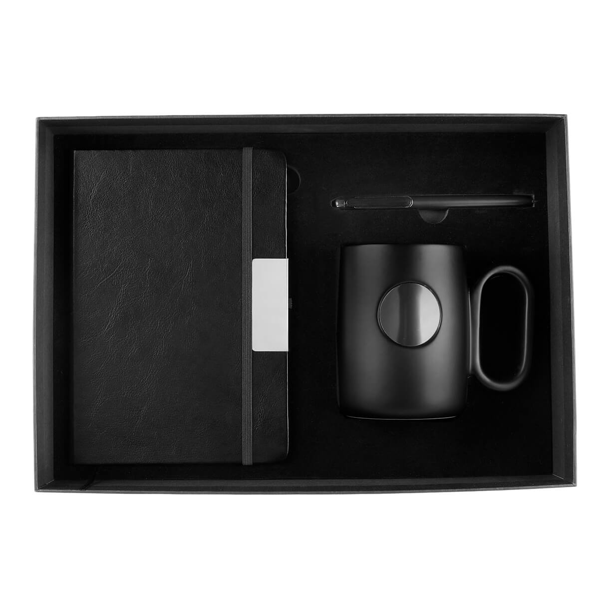 Descripción del producto: Set de regalo ejecutivo de 3 piezas. Contiene libreta de pasta dura con 80 hojas recicladas a raya y placa metálica. Incluye listón separador y elástico porta bolígrafo. Bolígrafo de plástico con mecanismo pulsador y taza de carámica con placa metálica circular. Capacidad de 473 ml. Incluye caja de regalo rígida. |