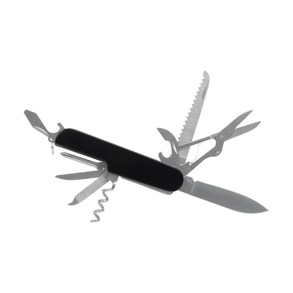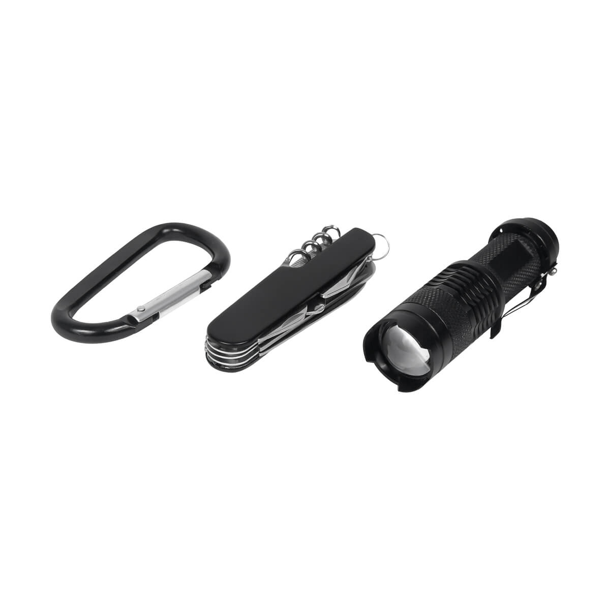 Descripción del producto: Set de herramientas multiusos. Incluye gancho metálico, lámpara con luz ajustable y navaja con 9 funciones: (navaja, sierra, tijeras, destapador, abrelatas, sacacorchos, guía de hilo, lima y desarmador de cruz). Incluye caja individual. |
