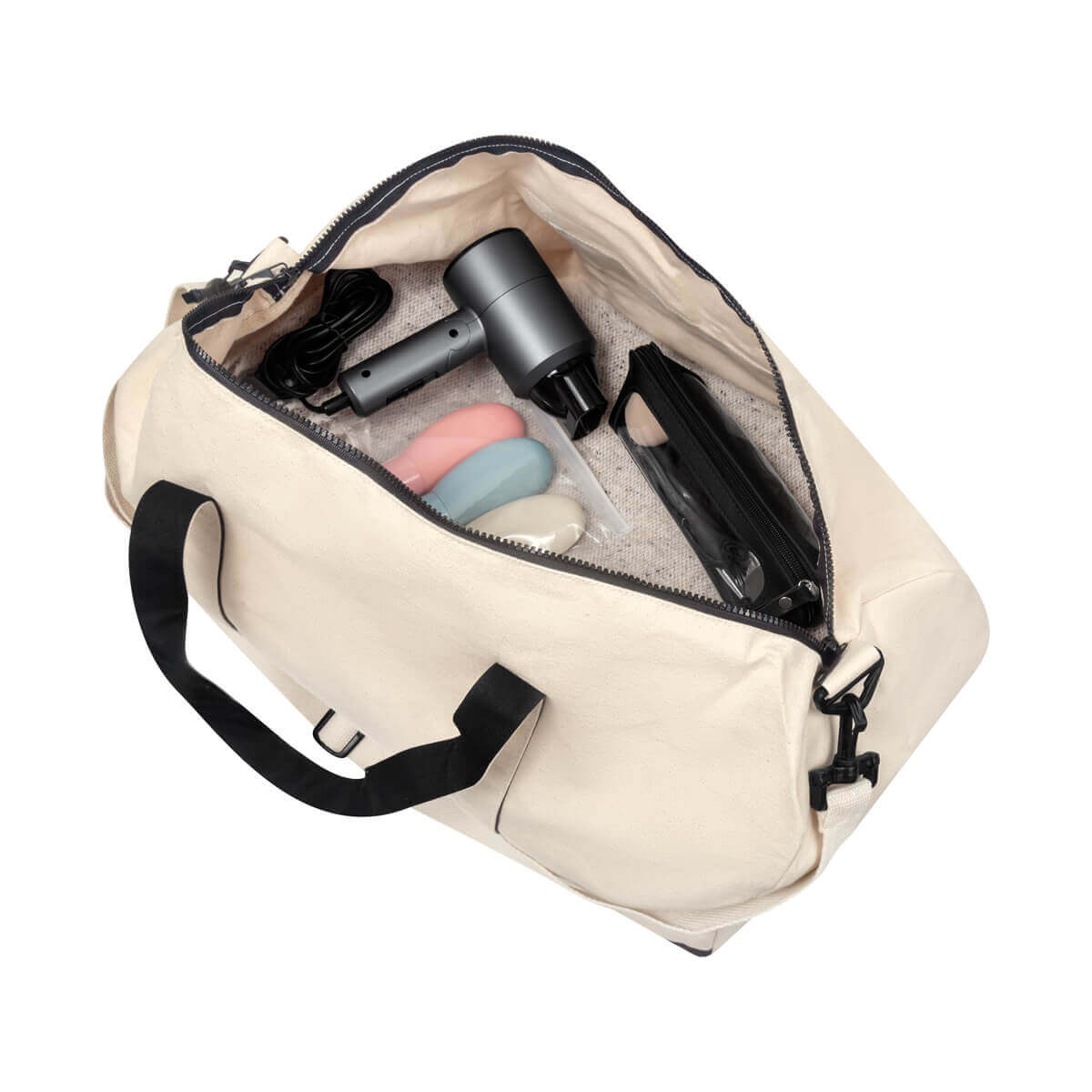 Descripción del producto: Su compartimento principal con cierre destaca por su tamaño súper amplio, perfecto para llevar todo lo necesario con comodidad. Incluye asas de mano para un fácil agarre y una práctica asa para hombro removible, sujeta con un broche de plástico para mayor seguridad. Además, cuenta con un bolsillo frontal con cierre que brinda acceso rápido a objetos pequeños o esenciales. Esta maleta ecológica está fabricada con material algodón, es la compañera ideal para viajes o escapadas de fin de semana. |