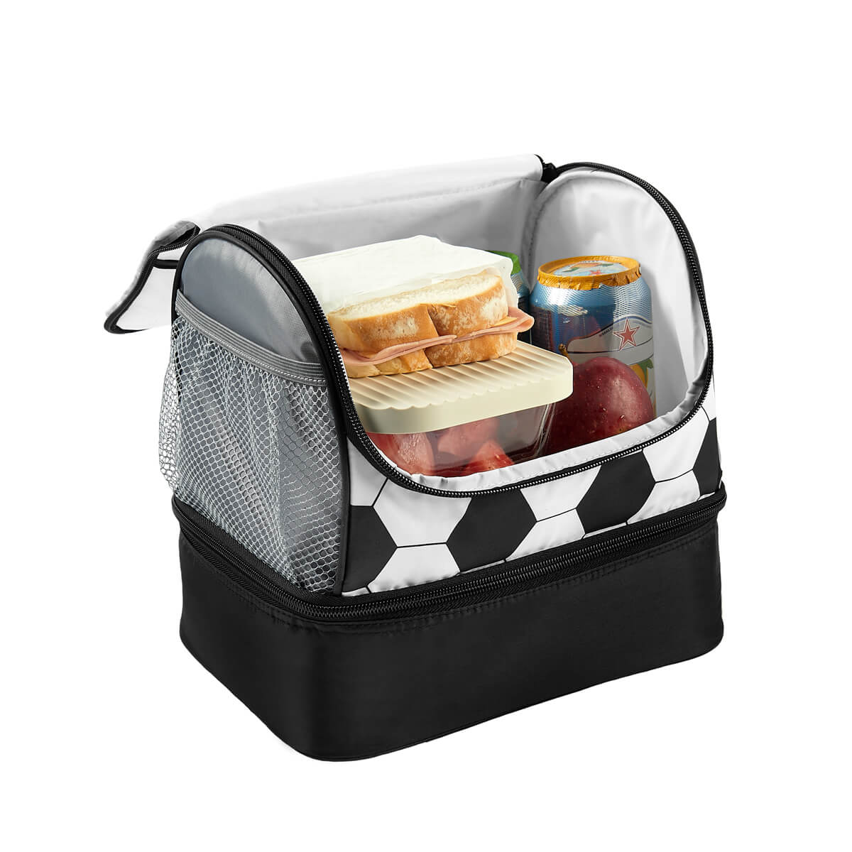 Descripción del producto: Lonchera con interior plastificado. Doble compartimento con cierre. Bolsa lateral de red y asa de agarre superior. Capacidad para 9 latas. |
