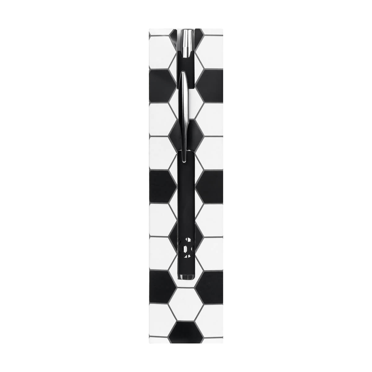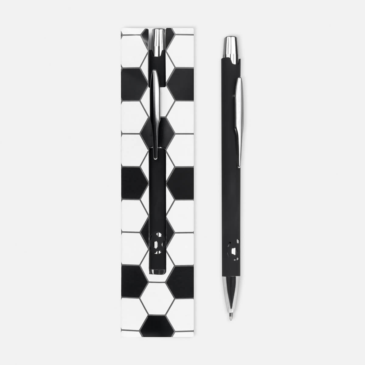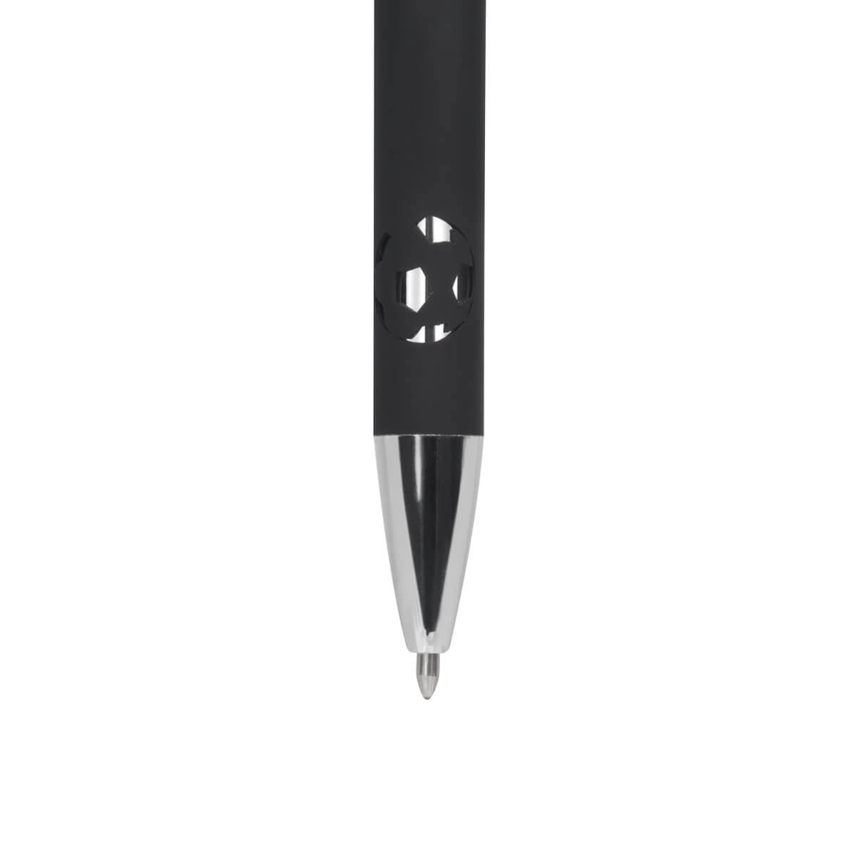 Descripción del producto: Bolígrafo metálico, con acabado mate y detalles cromados, con un diseño de balón suajado en el cuerpo. Mecanismo pulsador. Incluye funda con diseño soccer. |