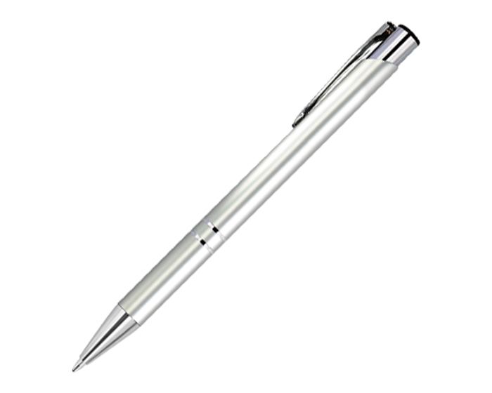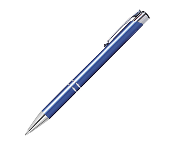 Descripción del producto: Bolígrafo de aluminio de tinta azul, con clip, punta y detalles en cromo. Mecanismo de click. |