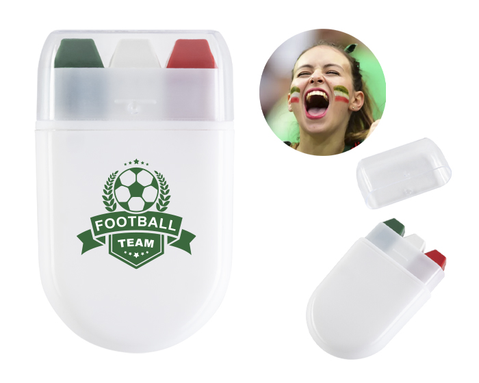 Descripción del producto: Barra de pintura facial tricolor en verde, blanco y rójo; cuenta con estuche de plástico con tapa para su fácil aplicación y manejo. |