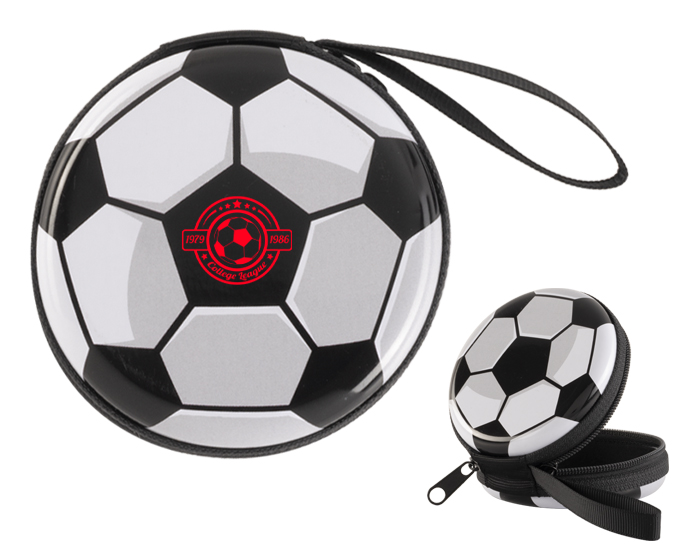 Descripción del producto: Estuche monedero en forma de balón de soccer, cuenta con cierre lateral doble y jareta. |