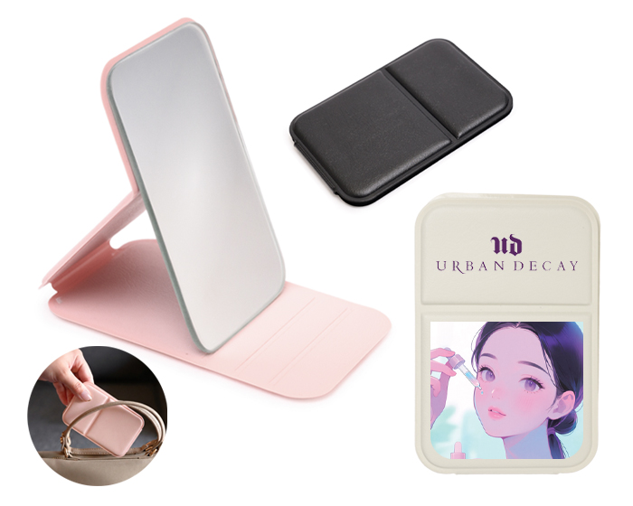 Descripción del producto: Espejo de bolsillo plegable, cuenta con cubierta de PU que sirve para proteger el espejo y como soporte con 3 niveles de inclinación. |