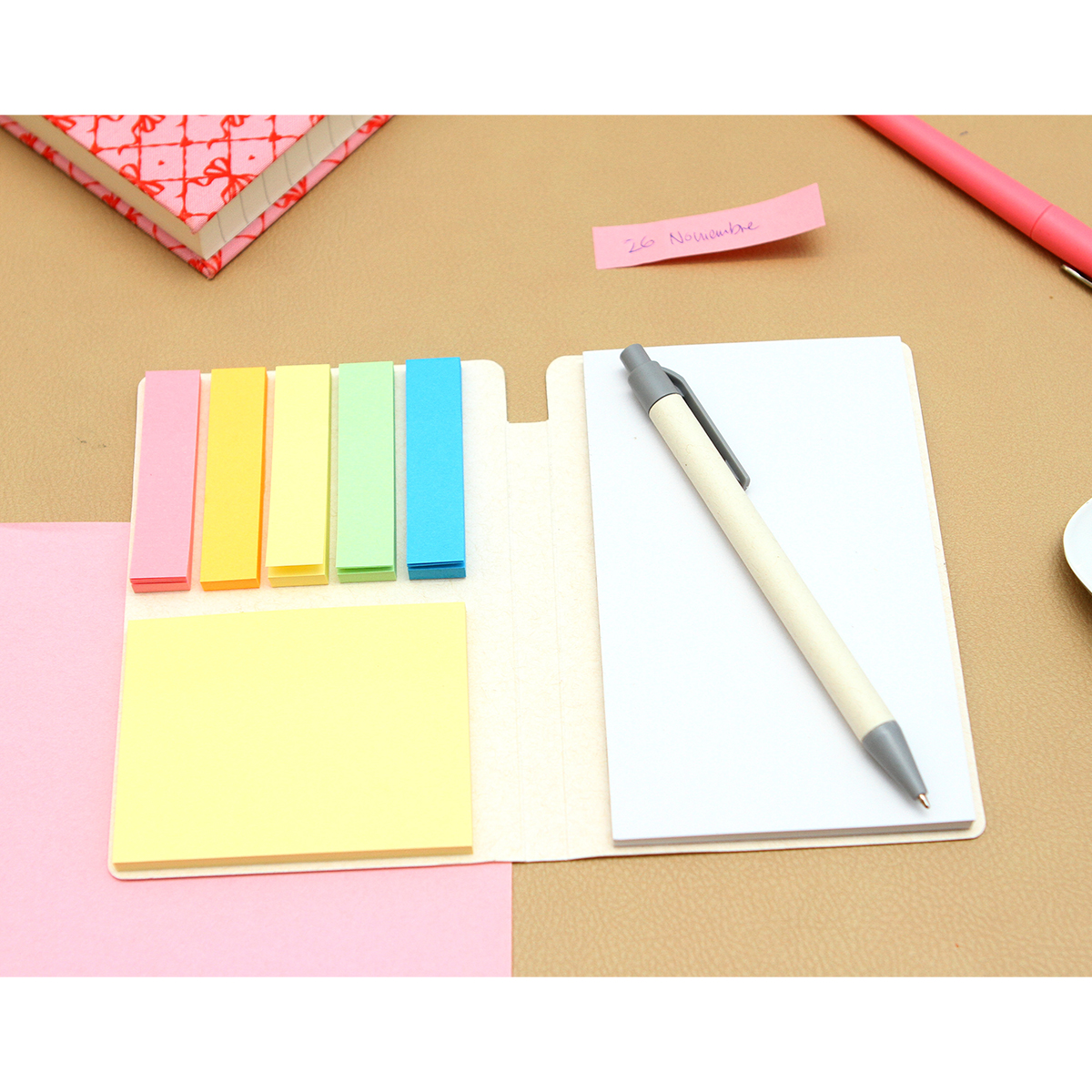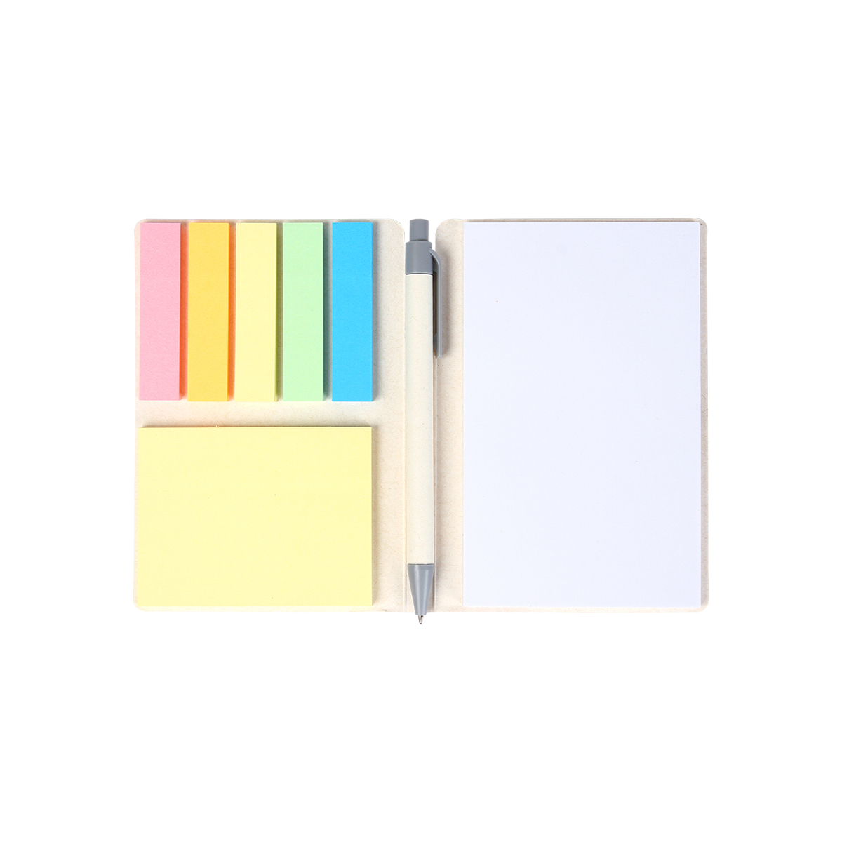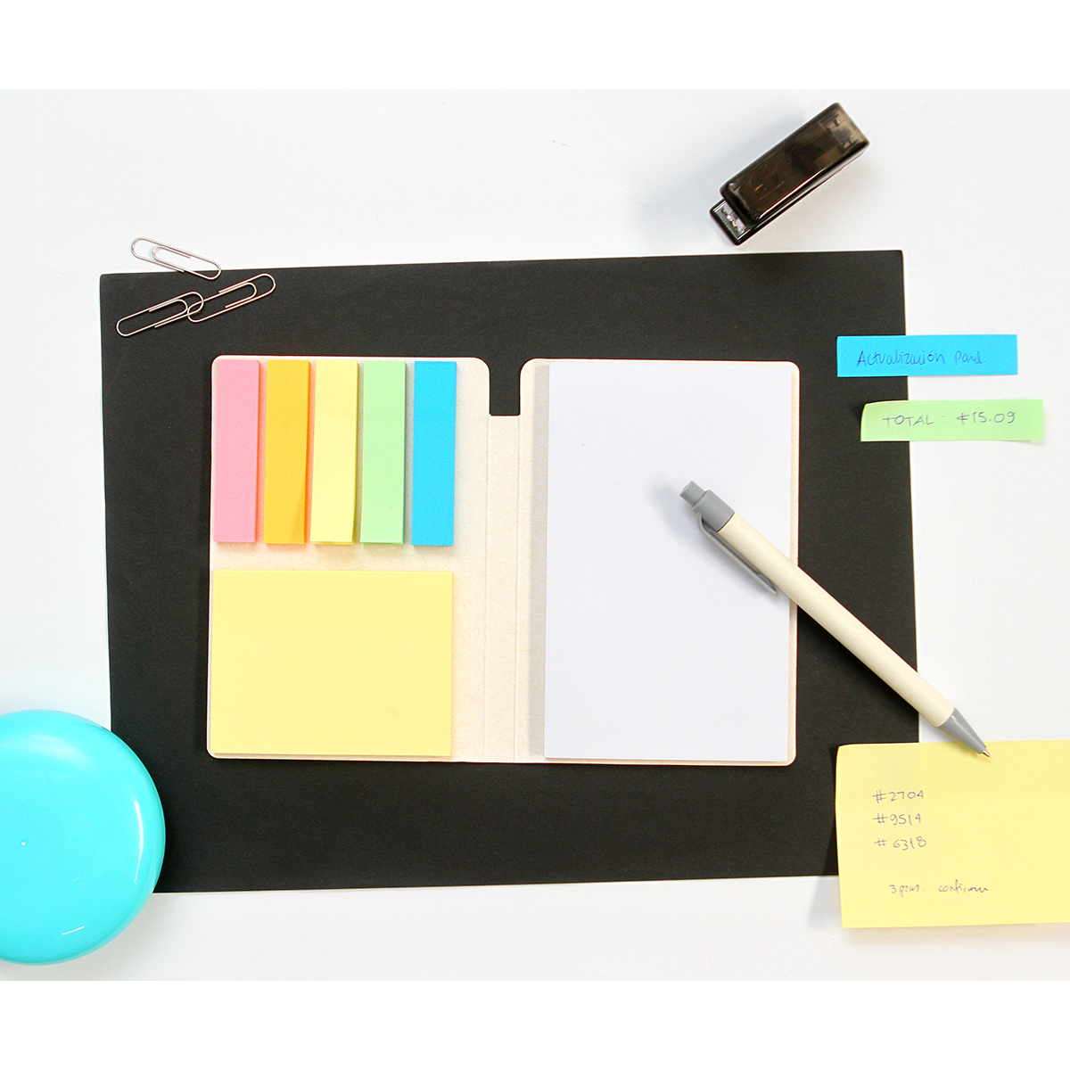 Descripción del producto: Block de notas adhesivas con cubierta fabricada en papel de leche. Incluye 6 colores con 50 hojas adhesivas, 50 hojas interiores en blanco y 1 bolígrafo estilo barril fabricado en cartón de leche con tinta de escritura negra. Perfecto para organizar, estudiar o regalar. |