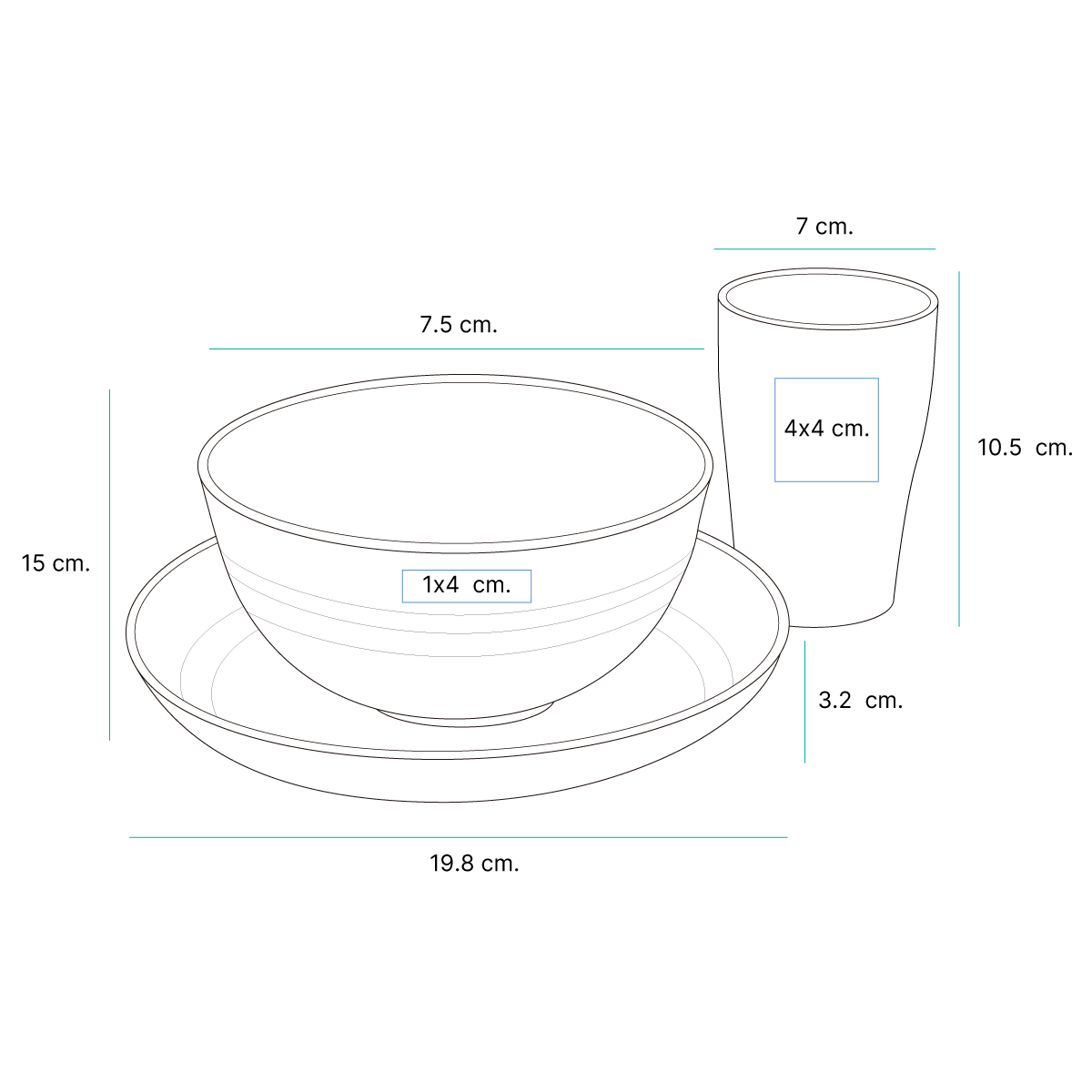 Medida: Platos: 19.8x3.2 cm. | Bowl: 15x7.5 cm. | Vaso: 7x10.5 cm. | Caja: 23x18.5x20.5 cm. Material: - Capacidad: - |