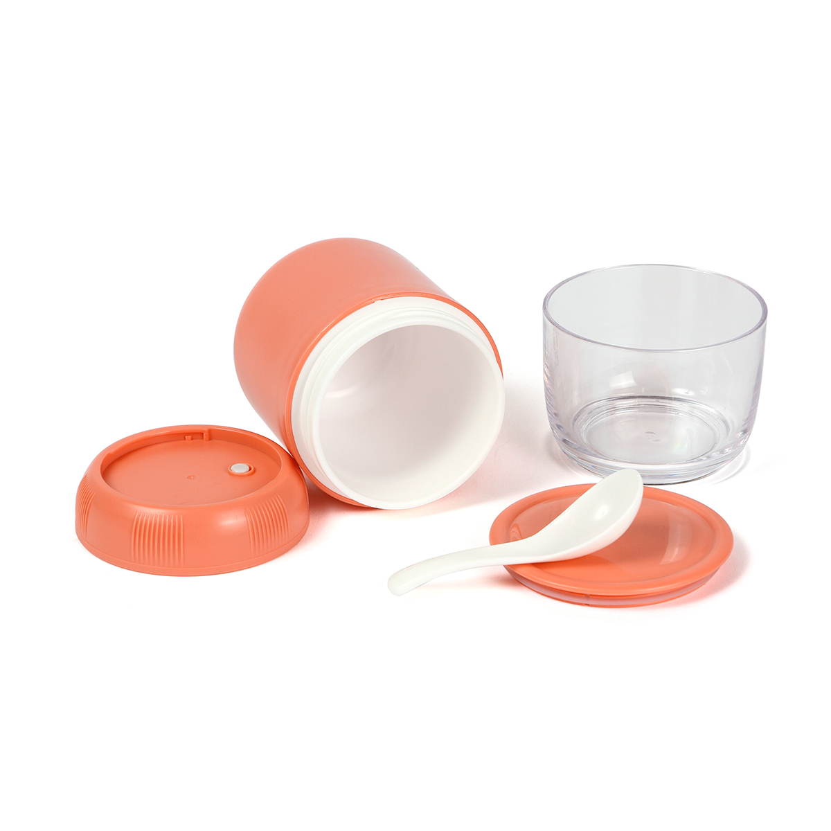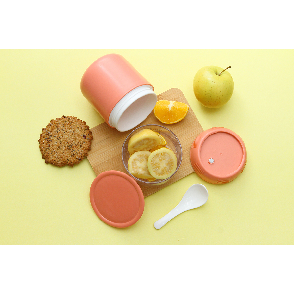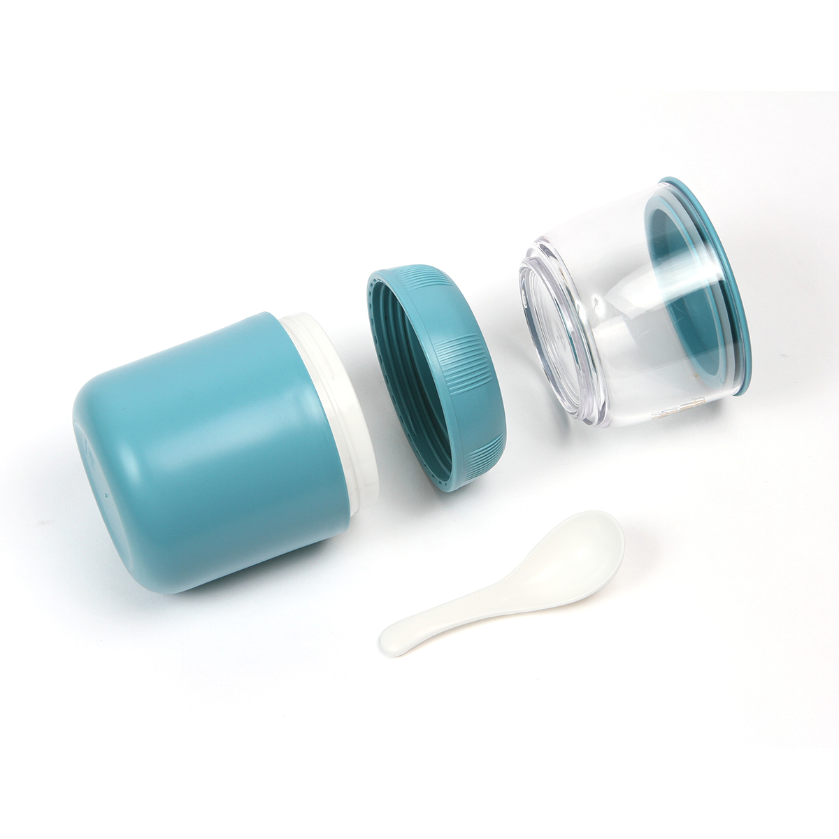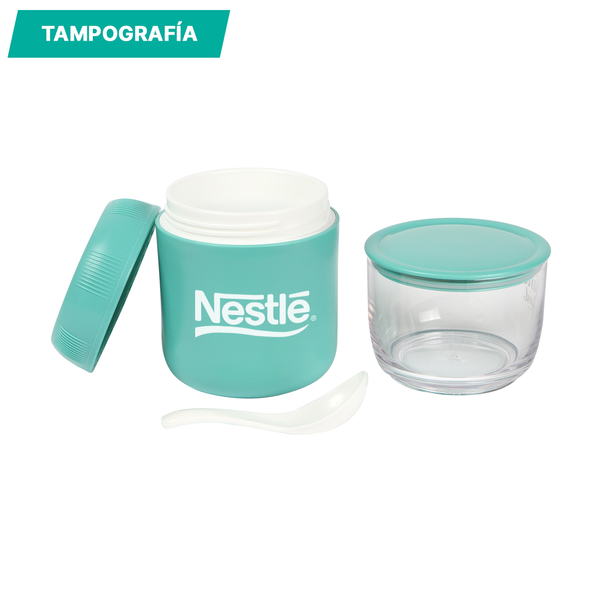 Descripción del producto: Contenedor de alimentos fabricado en polipropileno (PP). Incluye dos recipientes pequeños, uno de ellos traslúcido y una cuchara. Capacidad por ambos contenedores es de 710 ml. Contenedor grande: 380 ml. Contenedor pequeño: 330 ml. |