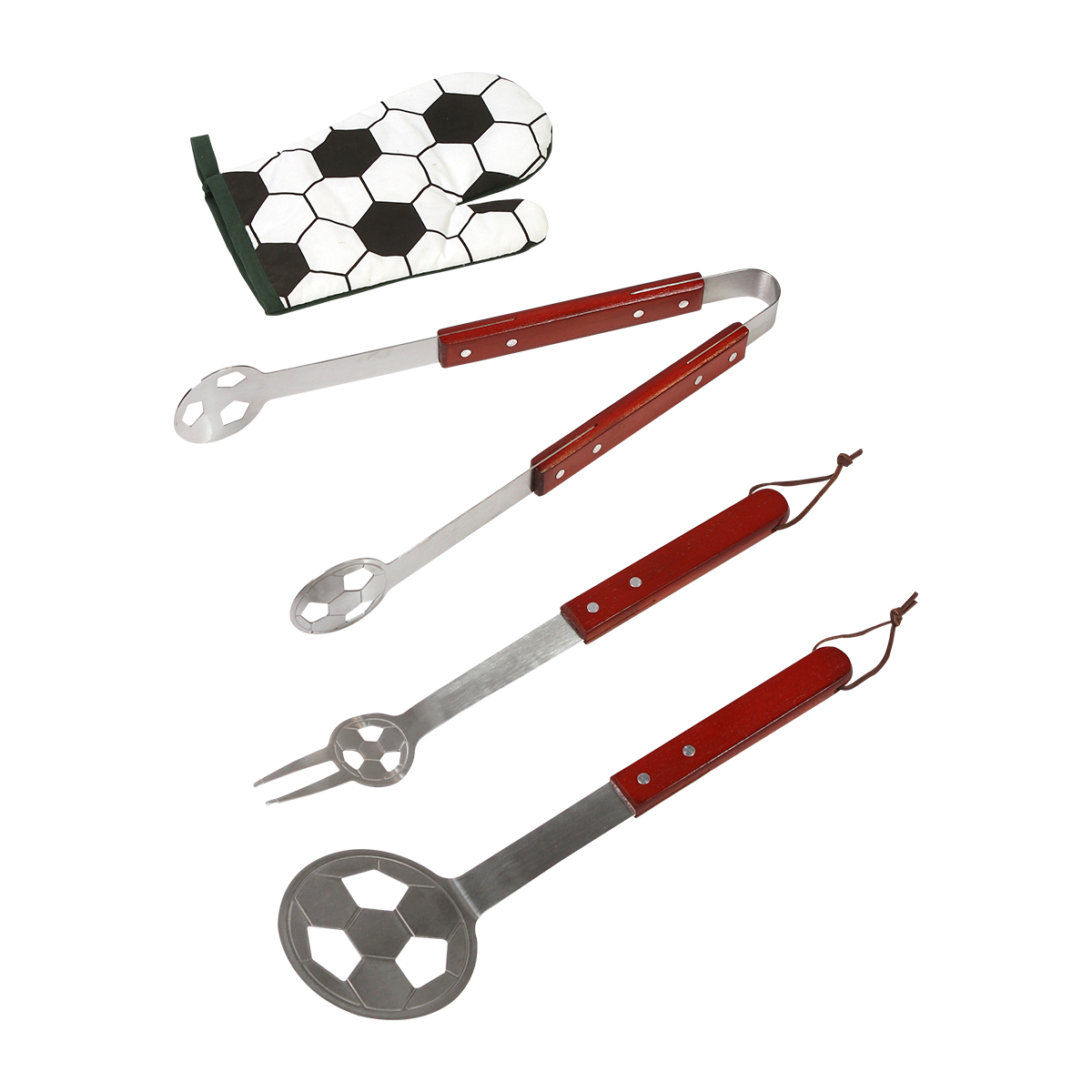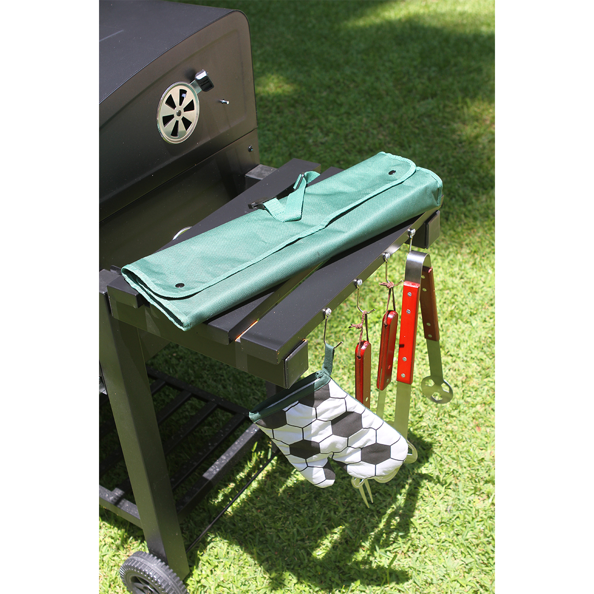 Descripción del producto: Set de BBQ con mandil fabricado en poliéster y herramientas de acero inoxidable. Incluye mandil con diseño de cancha de fútbol, tirante ajustable para el cuello y cintas para amarre en la cintura. Cuenta con bolsillos frontales integrados para organizar los accesorios. El set incluye espátula, pinzas, tenedor y una manopla. Su diseño permite guardar y transportar las herramientas dentro del mandil de forma práctica. |