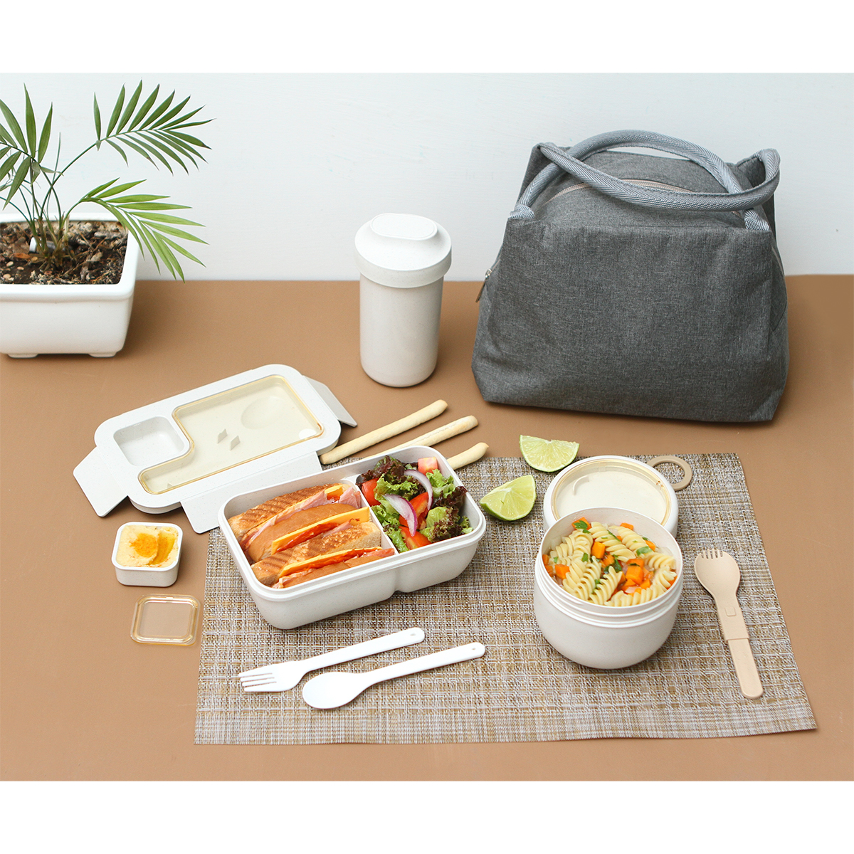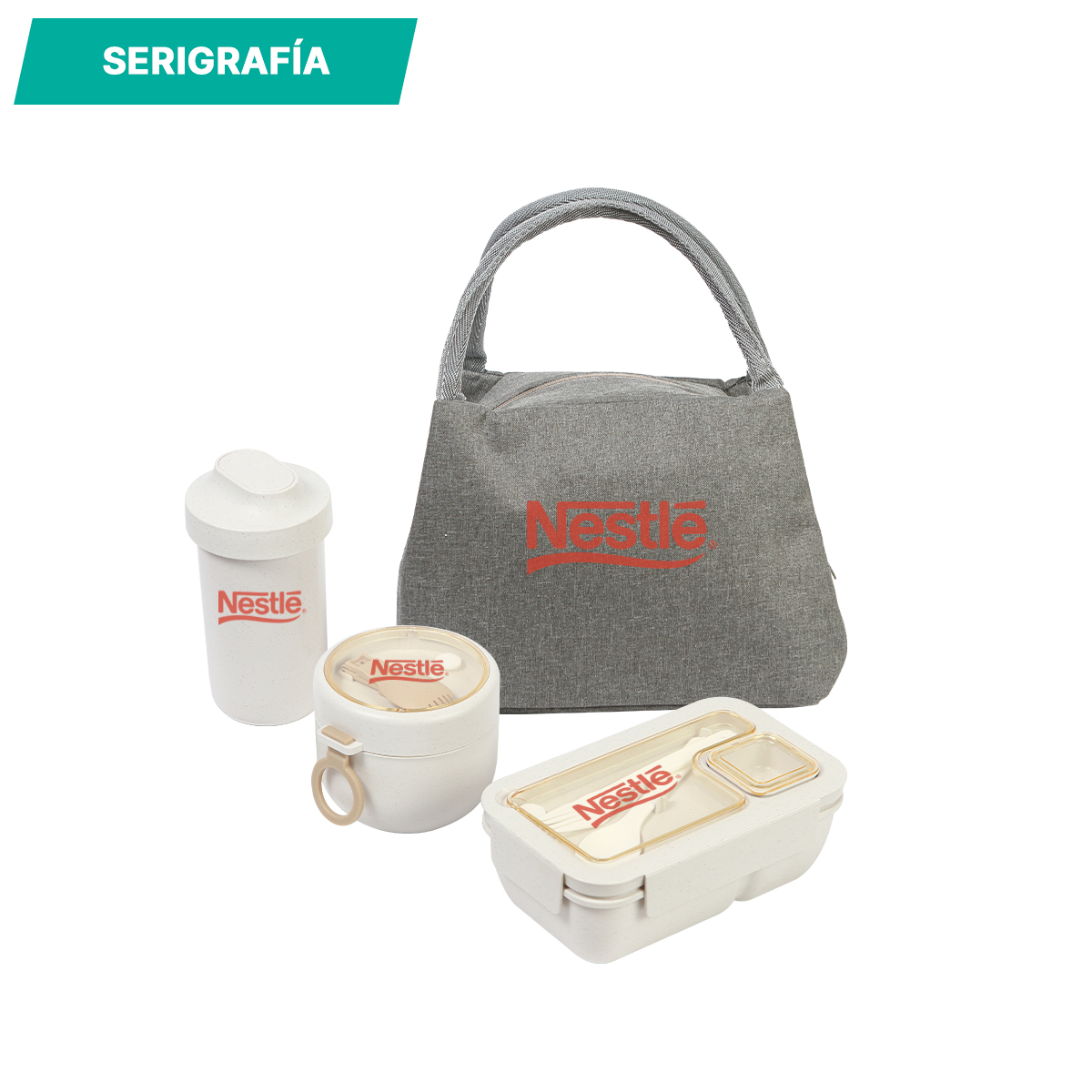 Descripción del producto: Set de alimentos con lonchera. Incluye una lonchera fabricada en poliéster con cierre superior y asas para transportarla fácilmente. El set cuenta con un vaso de plástico con tapa de 480 ml, un contenedor rectangular con dos divisiones y tapa transparente con capacidad de 850 ml, además de un recipiente pequeño para salsas o aderezos. También incluye un contenedor redondo de 600 ml con tapa transparente, así como un par de cubiertos reutilizables. Su diseño permite organizar y transportar alimentos de forma práctica para el día a día. |