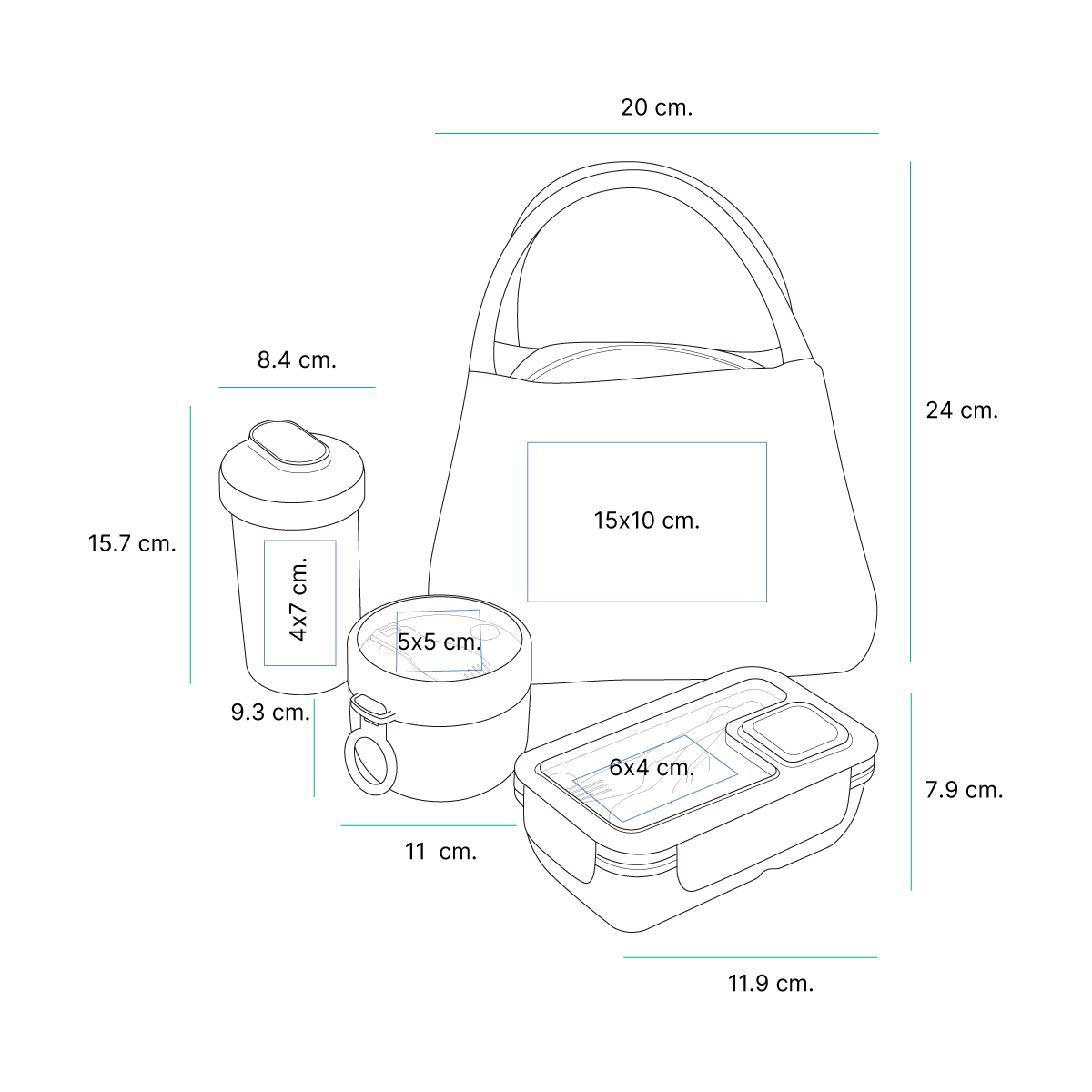 Medida: Contenedor rectangular: 9.5x11.9x7.9 cm. | Contenedor redondo: 9.3x11 cm. | Vaso: 8.4x15.7 cm. | Lonchera : 24x15.3x20 cm. Material: - Capacidad: - |