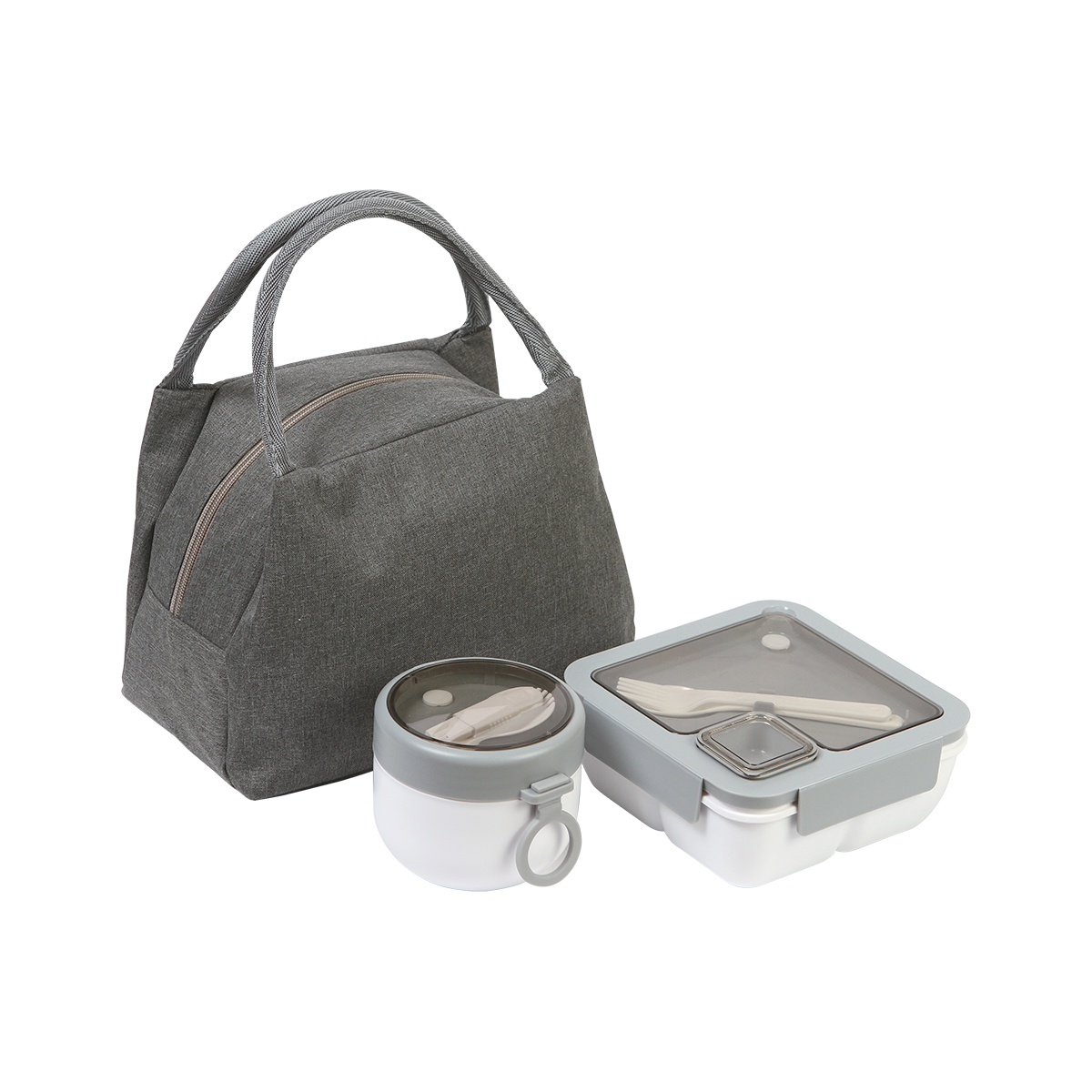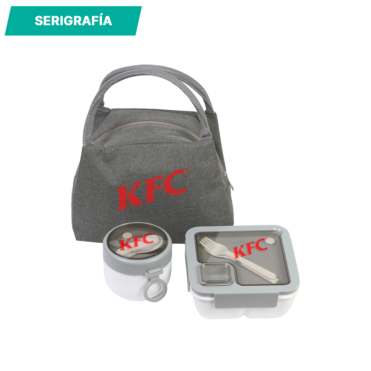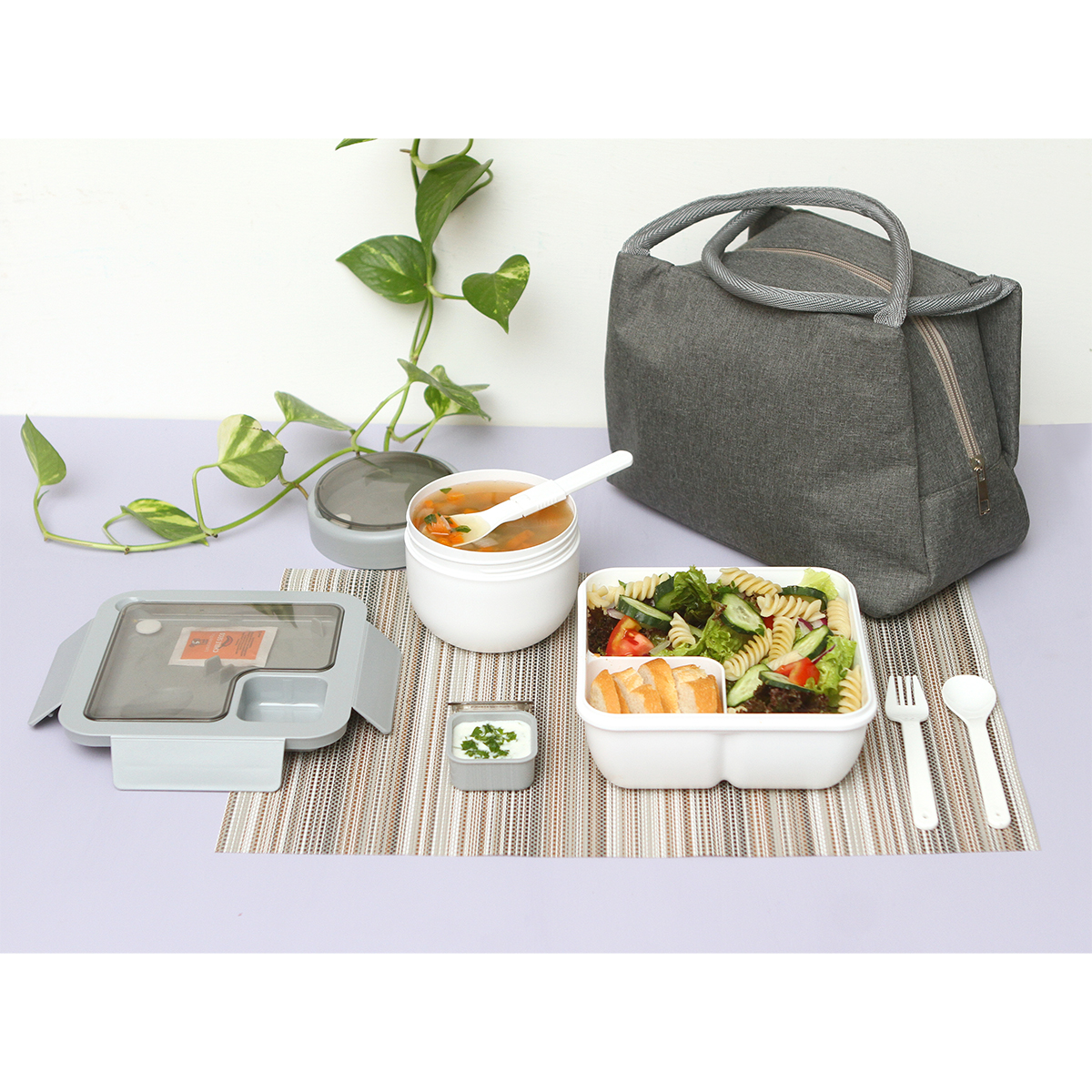Descripción del producto: Set de contenedores para alimentos con lonchera. Incluye una lonchera fabricada en poliéster con cierre superior y asas para transportarla fácilmente. El set incluye un contenedor cuadrado con dos divisiones y tapa transparente con capacidad de 1100 ml, además de un recipiente pequeño para salsas o aderezos. También incluye un contenedor redondo con tapa transparente de 600 ml, ideal para sopas o alimentos líquidos, así como un par de cubiertos reutilizables. Su diseño permite organizar y transportar alimentos de forma práctica para el día a día. |