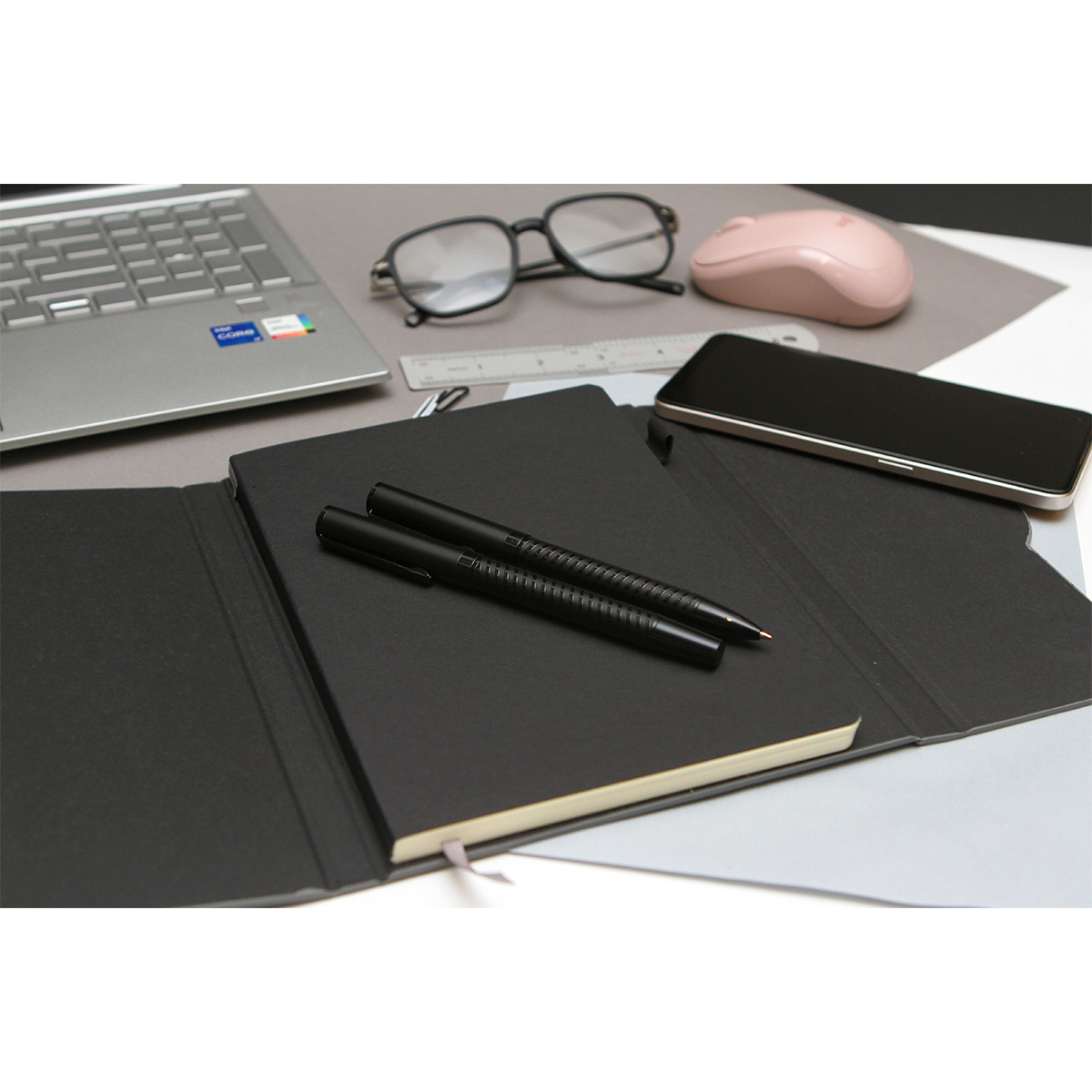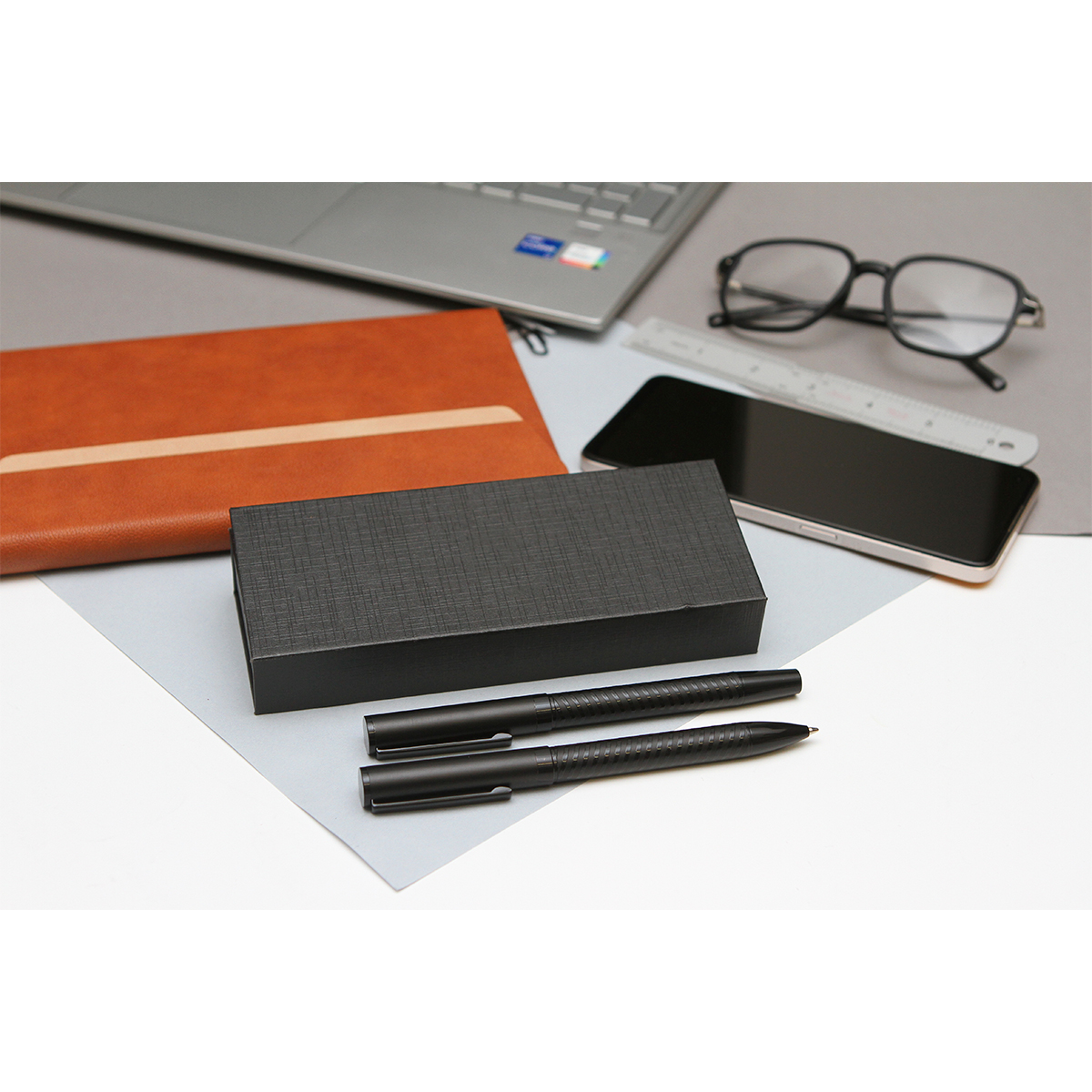Descripción del producto: Set ejecutivo de dos bolígrafos metálicos negros, incluye caja de regalo. Un bolígrafo con mecanismo retráctil y otro con mecanismo twist. |