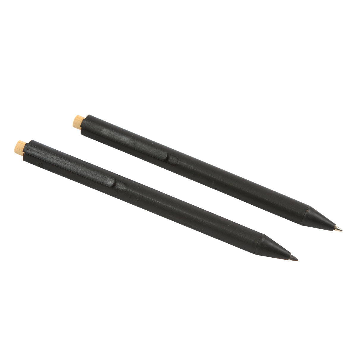 Descripción del producto: Juego ecológico de un bolígrafo fabricado en ABS y fibra de paja de trigo tinta azul y un lápiz tipo bolígrafo con punta infinita. Sostenibilidad e innovación en tu escritura diaria. Cuenta con estuche sencillo de cartón." |