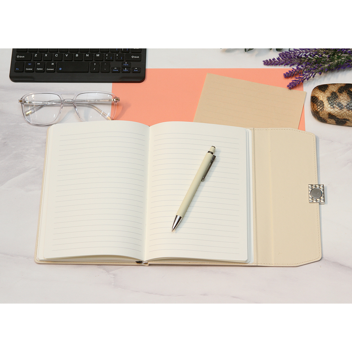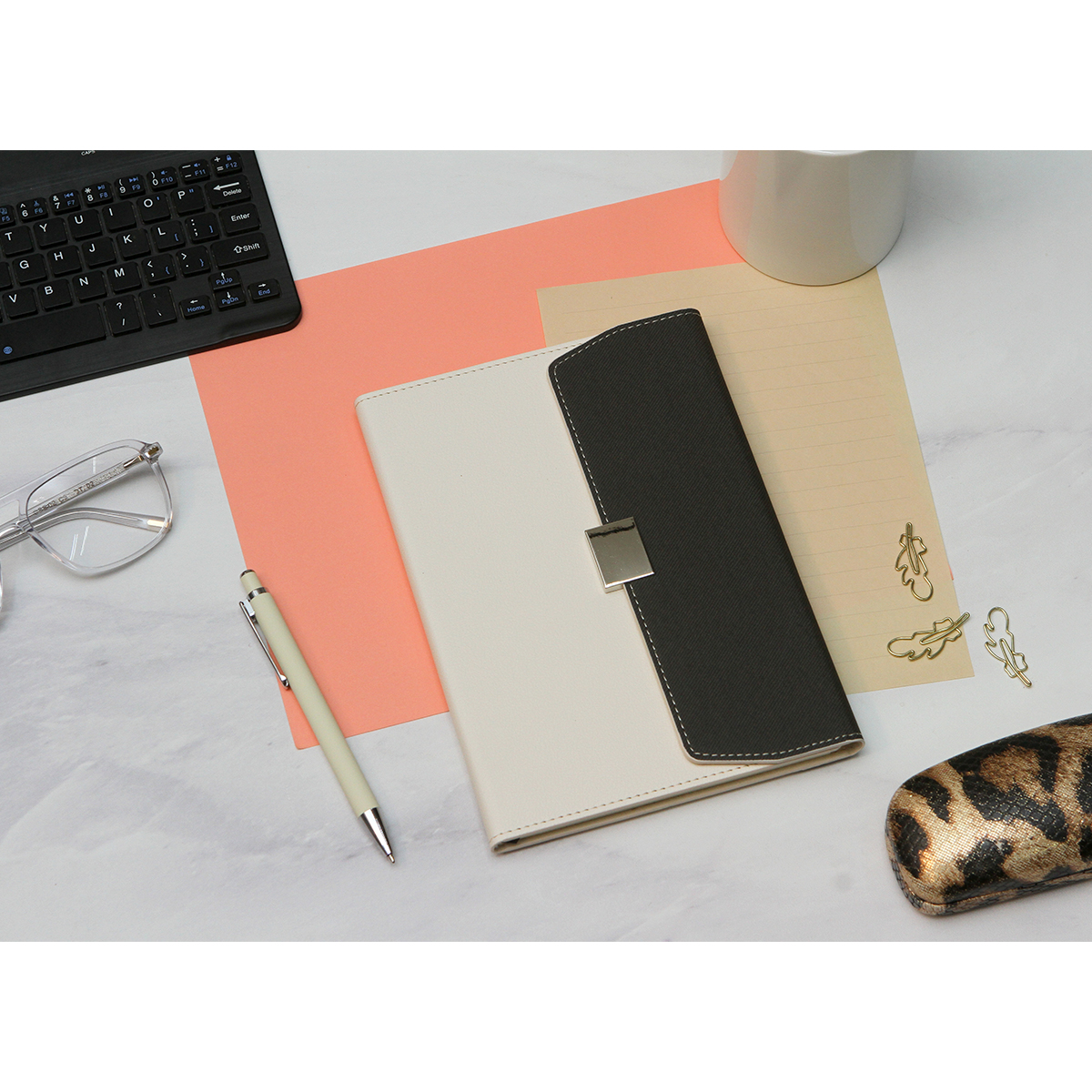Descripción del producto: Libreta con cubierta de pasta dura cubierta en curpiel, 80 hojas rayadas de 80 g. y listón separador de 6 mm. Incluye un bolígrafo con barril fabricado en aluminio de acción de botón, tinta negra. Ideal para uso profesional o académico. |