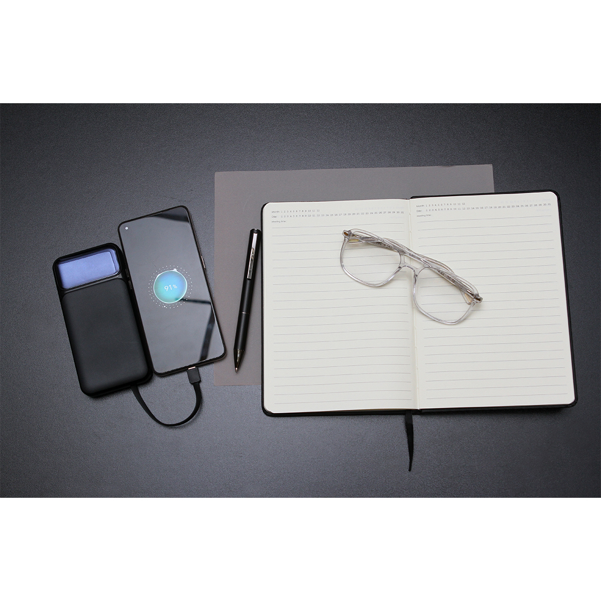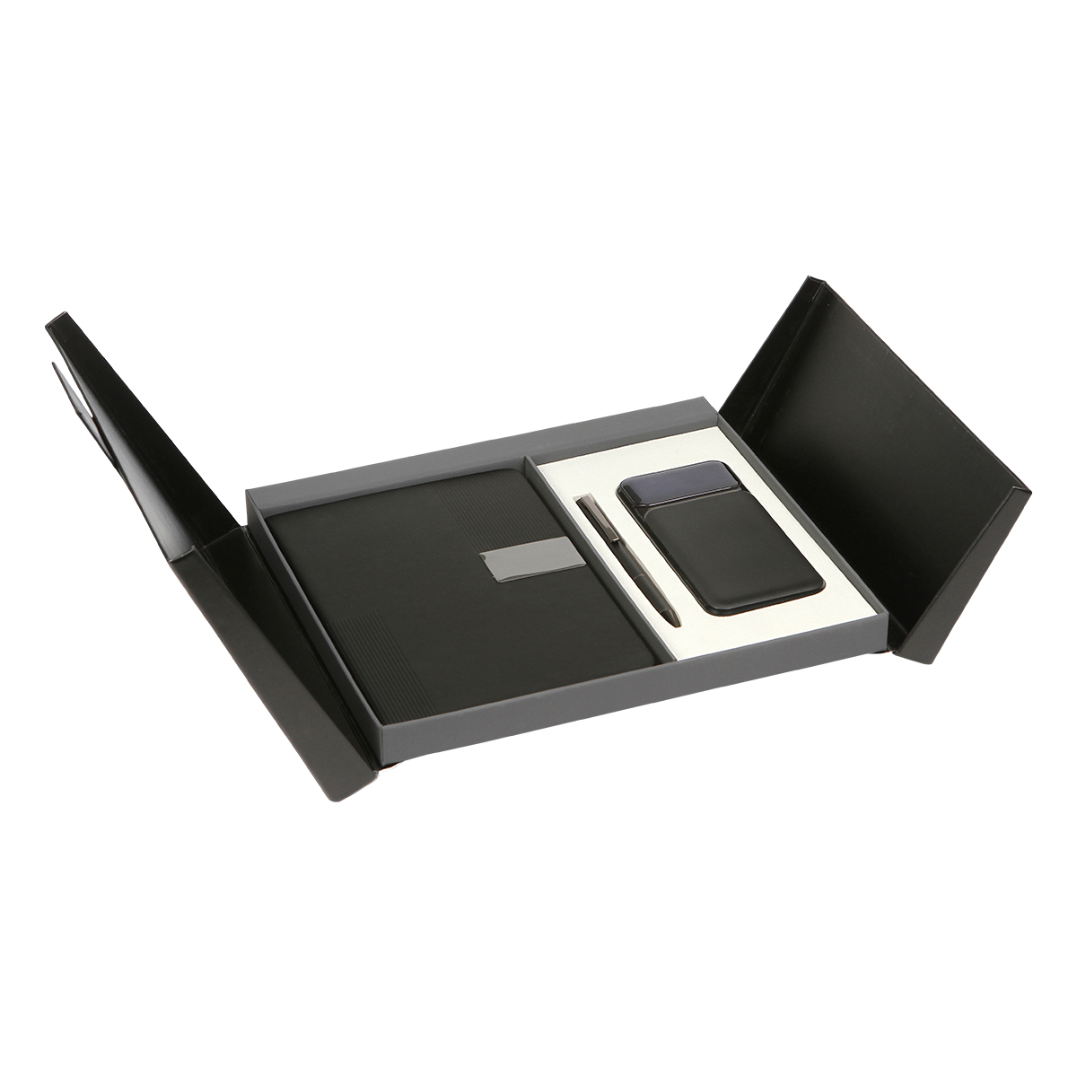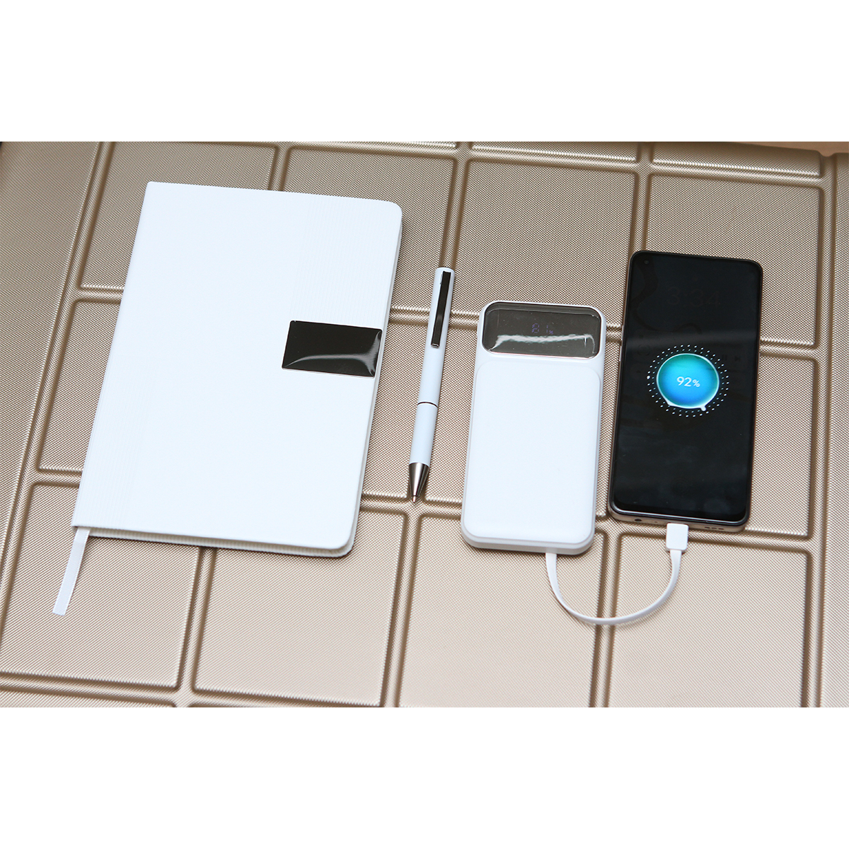 Descripción del producto: Set ejecutivo premium, incluye una libreta de 100 hojas de 80 g, bolígrafo tipo ball pen fabricado en acero inoxidable con TINTA DE ESCRITURA EN COLOR NEGRO y power bank fabricado en PC y ABS. Capacidad de la batería 10,000 mAh (5V=2A). Entradas de tipo USB y tipo C, salidas de tipo C, USB y lightning. Elegancia y funcionalidad en un solo kit. |