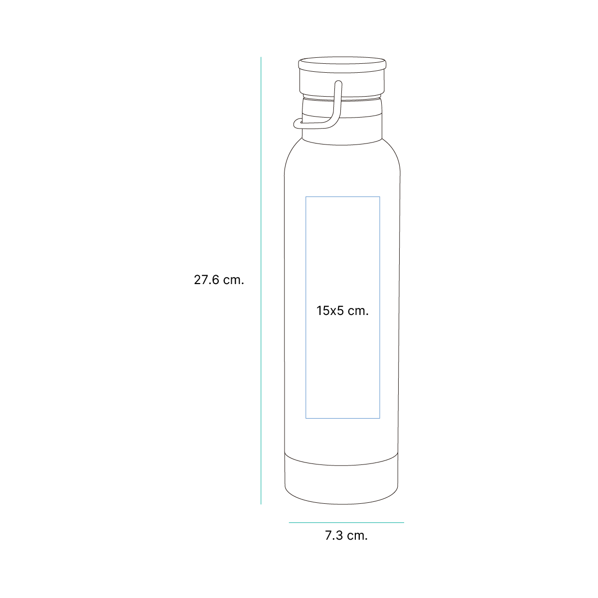 Descripción del producto: Botella con asa fabricada en acero inoxidable reciclado doble pared con tapa de rosca fabricada en bambú, detalles en la base del mismo material. Capacidad de 600 ml, es una opción sostenible y elegante para mantener tus bebidas frías o calientes mientras contribuyes al cuidado del medio ambiente, incluye caja individual |