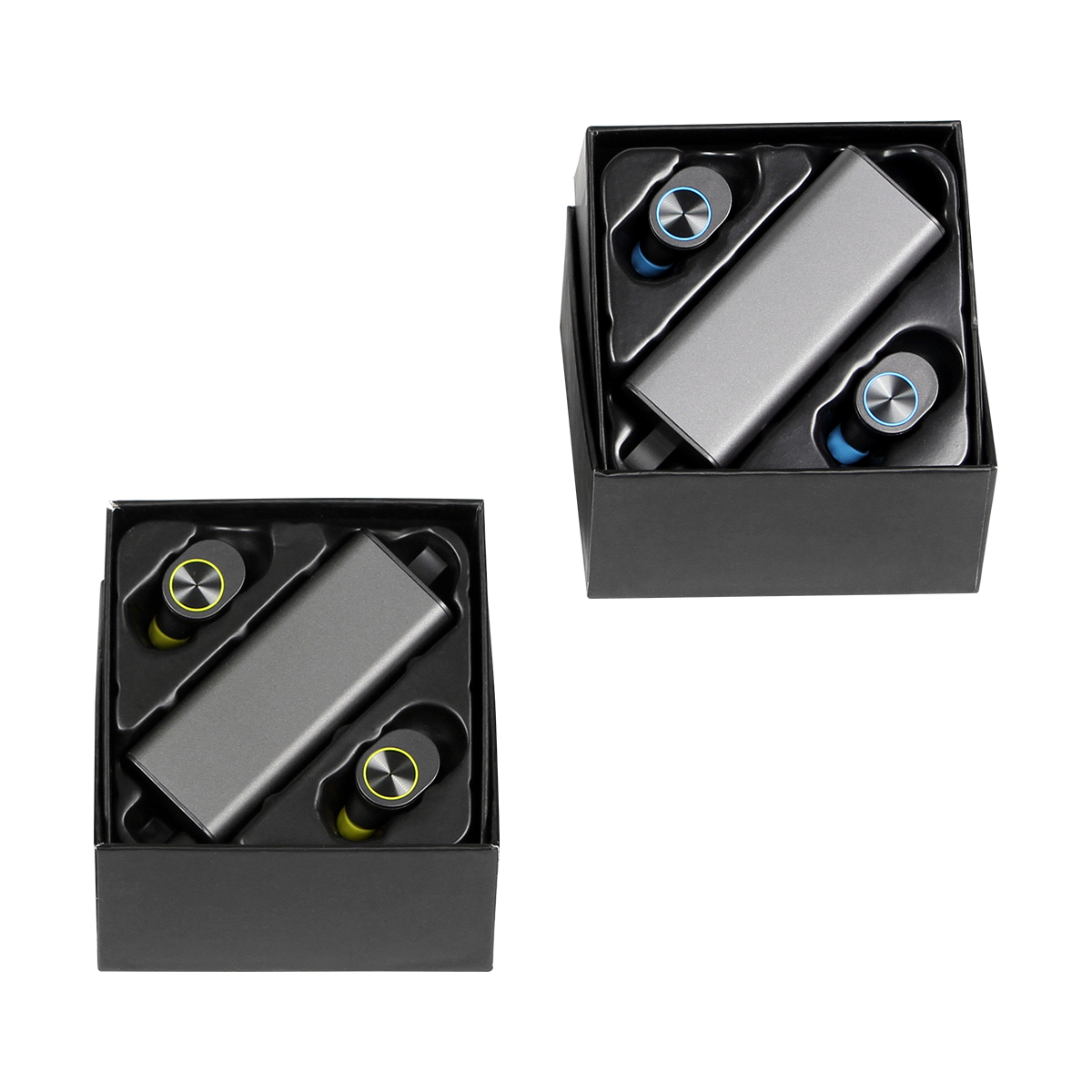 Descripción del producto: Audífonos con conexión de sonido sin cables y estuche metálico rectangular para carga con interior de color y función de manos libres. |