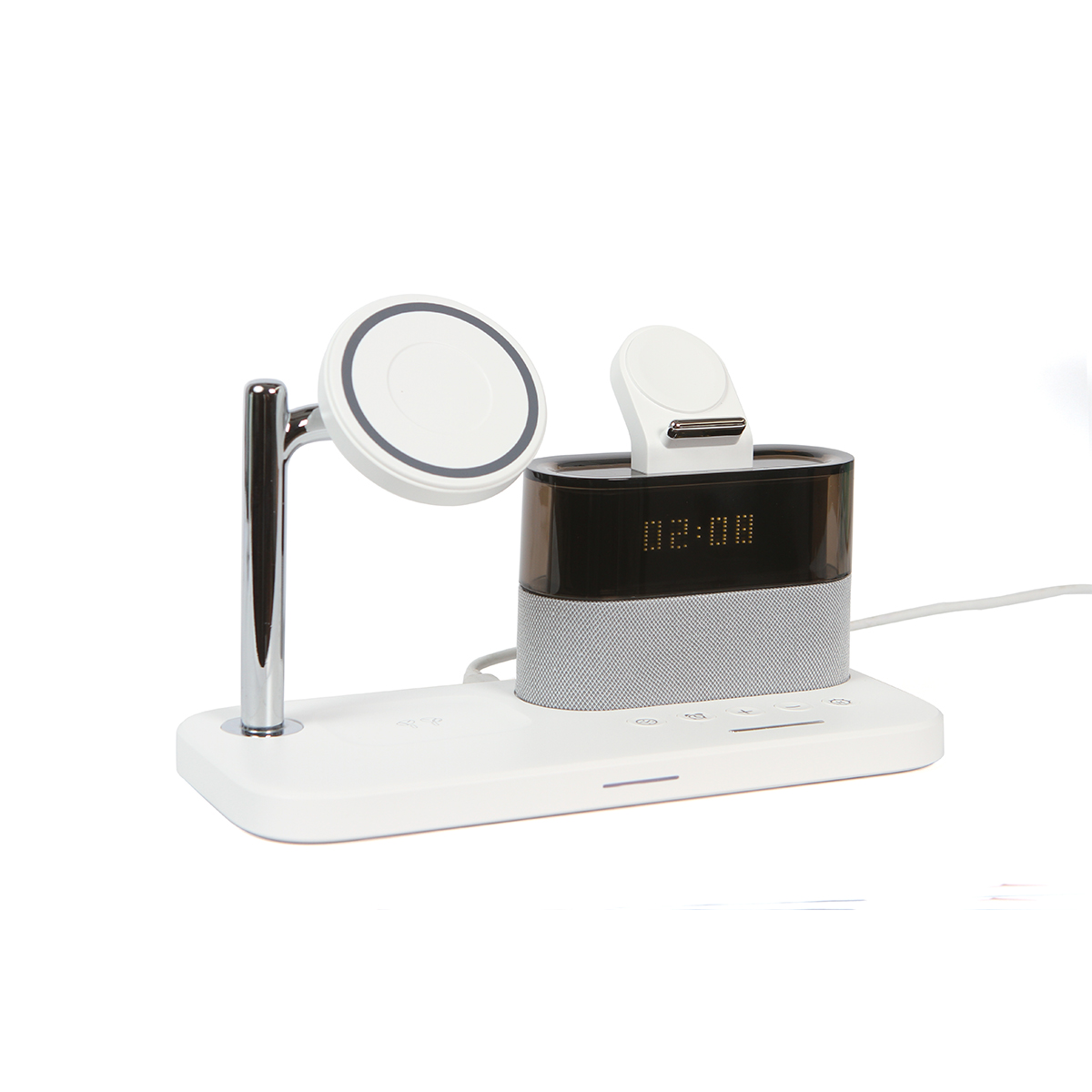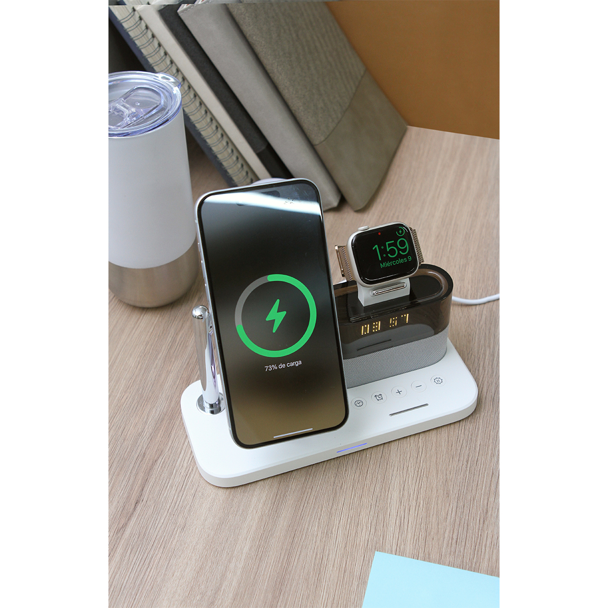 Descripción del producto: Cargador con imán multifuncional para teléfono celular y audífonos inalámbricos. Con reloj y función de alarmas, incluye una lámpara de lectura. Diseño ergonómico especializado para escritorio y/o buró. |