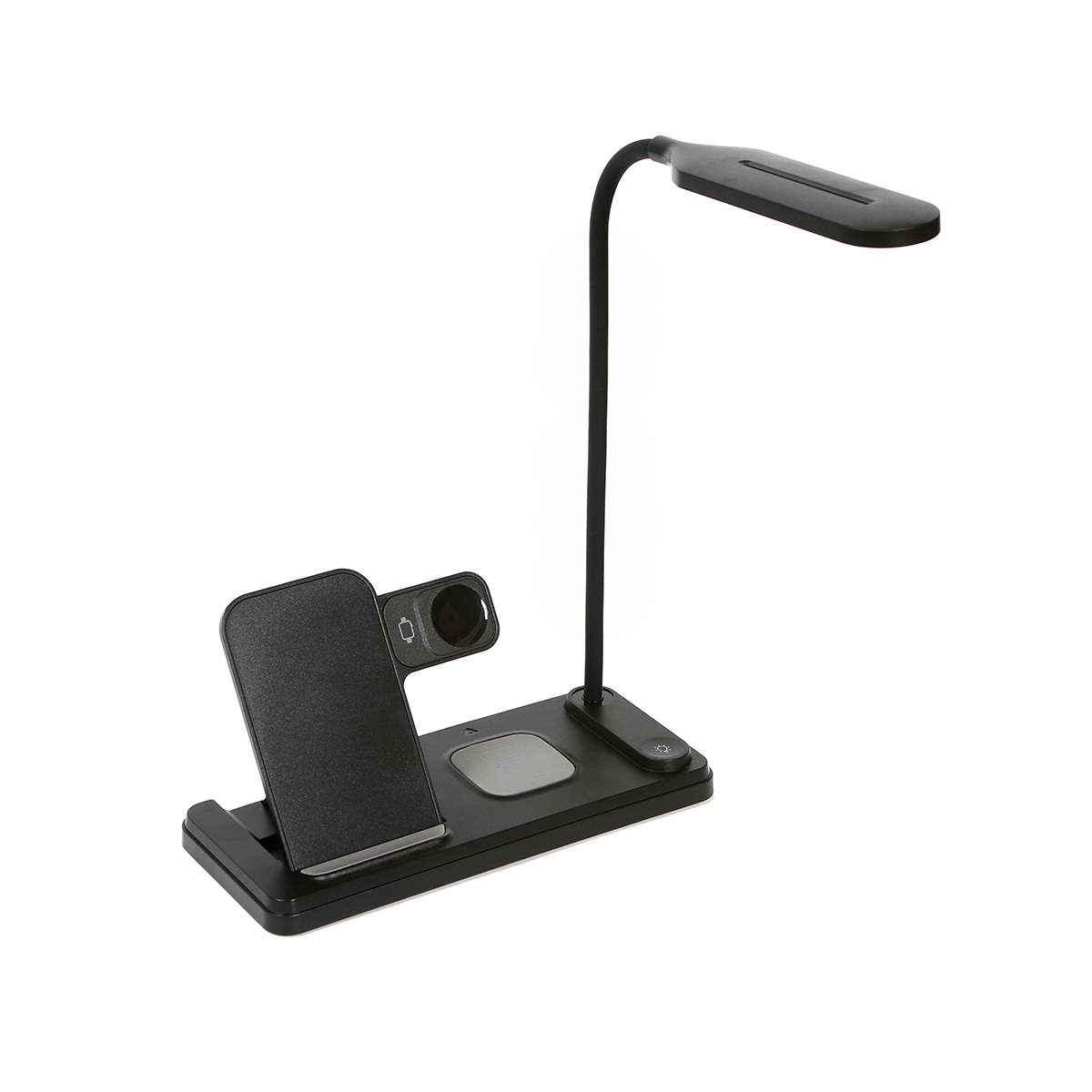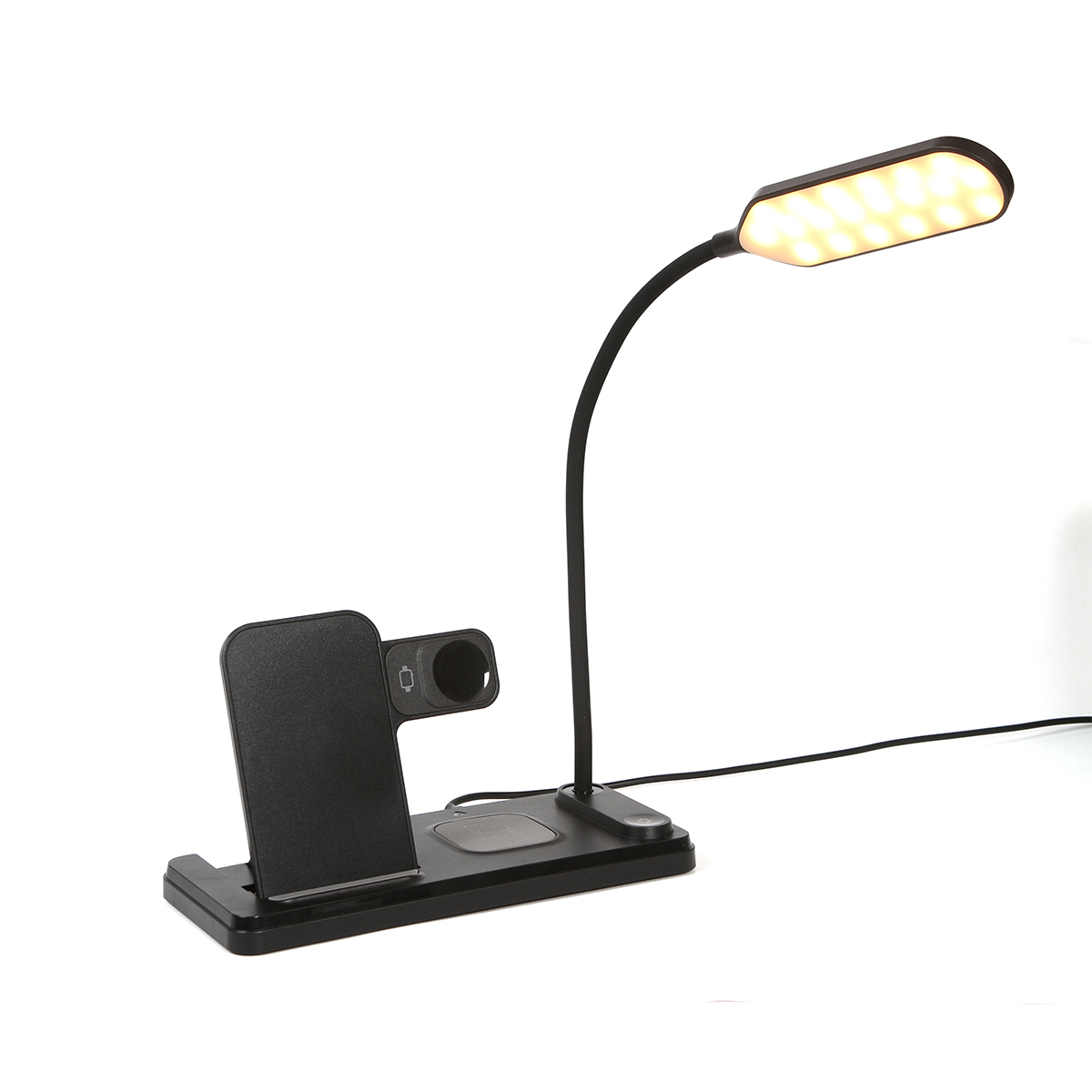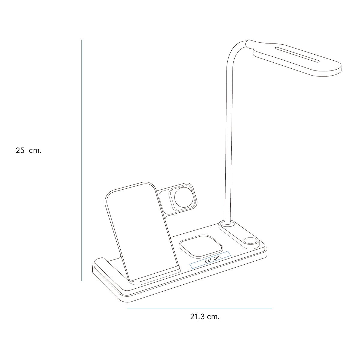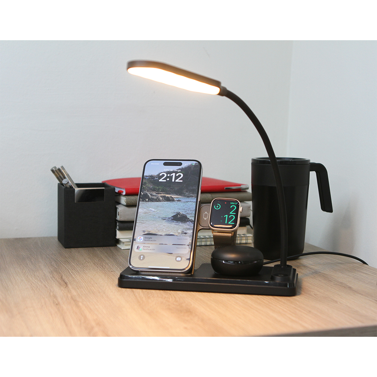 Descripción del producto: Cargador inalámbrico multifuncional para teléfono celular, audífonos y reloj inteligentes. Con reloj y función de alarmas, incluye una lámpara ajustable con tres niveles de luz, blanca, cálida y neutra. Diseño ergonómico especializado para escritorio y/o buró. Producto innovador con diseño elegante. |