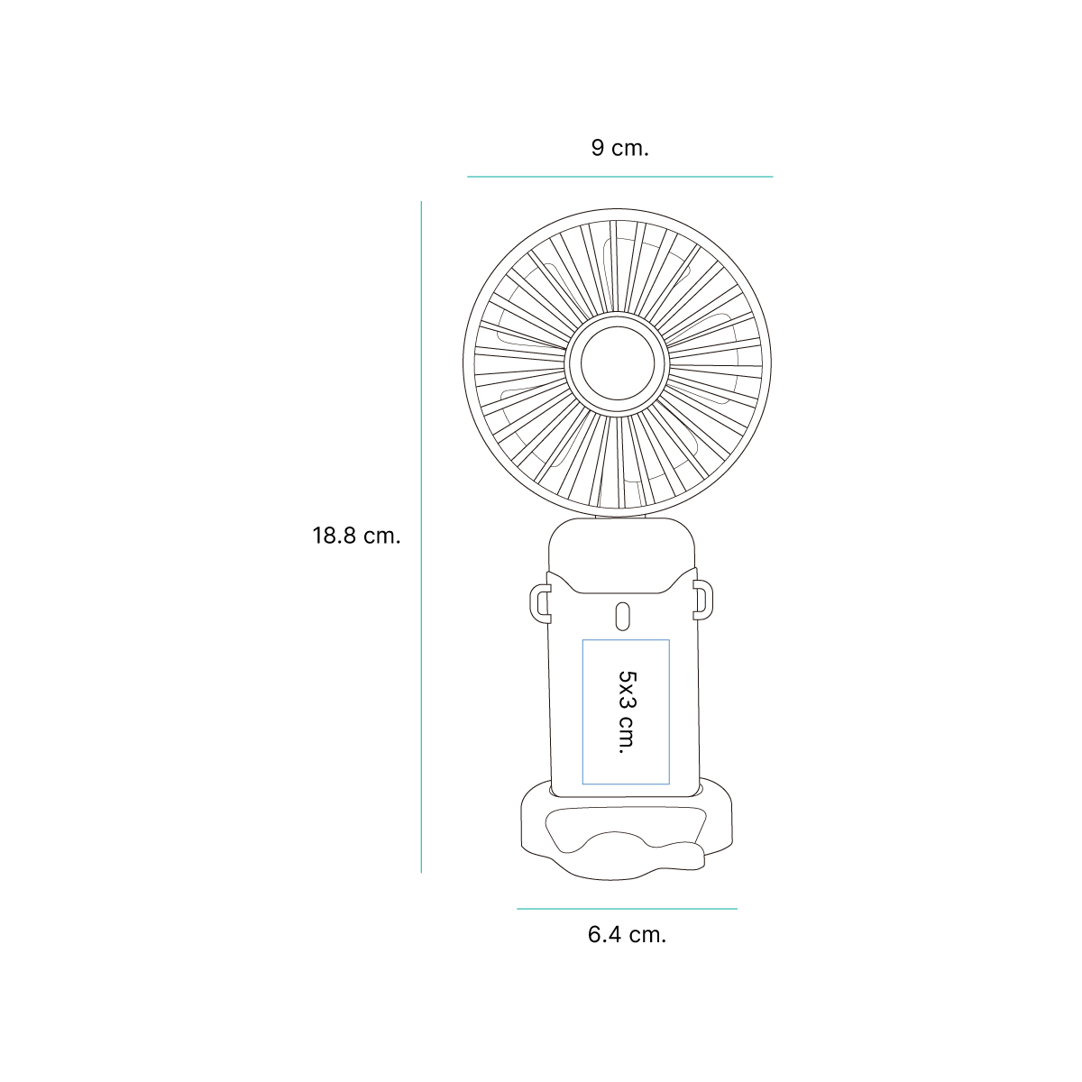 Medida: Ventilador: 18.8x9x4.65 cm. | Base: 6.4x6.4x1.6 cm. Material: - Capacidad: - |